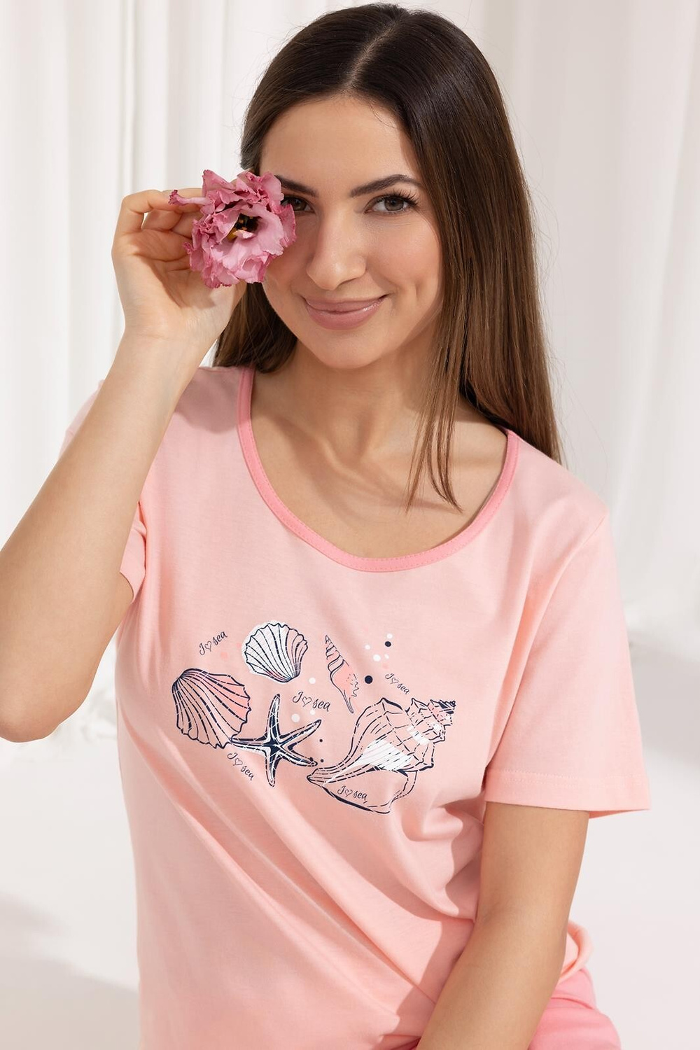 Piżama damska - wysokiej jakości bawełna - koszulka z krótkim rękawem - dekolt półokrągły - na wysokości piersi kolorowa grafika - jednolite spodnie typu rybaczki - w pasie gumka obszyta bawełną Skład: 100% bawełna