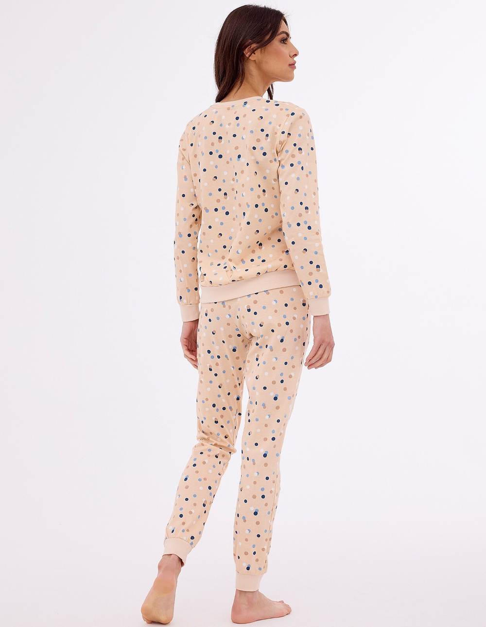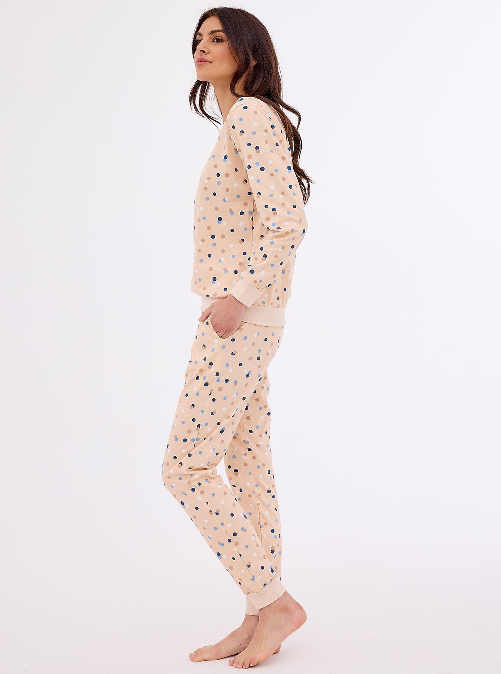 Piżama damska - wysokiej jakości bawełna - wzór w groszki - koszulka z długim rękawem - długie spodnie z wygodnymi kieszeniami - w pasie gumka - mankiety, dół koszulki i nogawki zakończone ściągaczem - pakowana w pudełko Skład: 100% bawełna