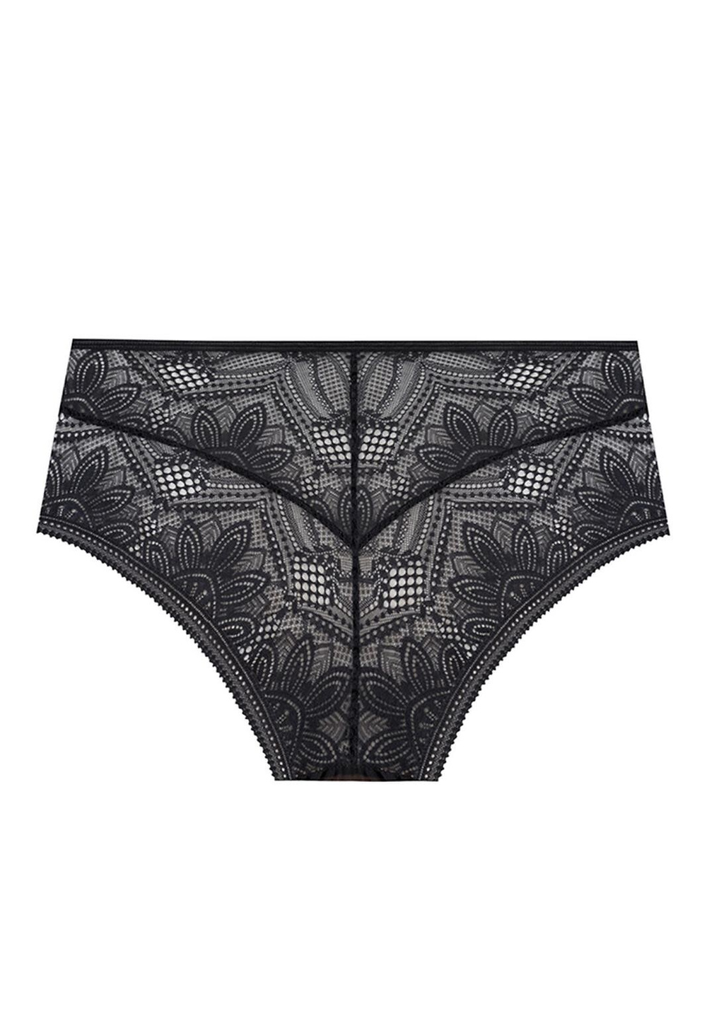 Kiedyś NIPPLEX teraz MEFEMI. Figi damskie - czarna koronka w połączeniu z tiulową siateczką - tył z ażurowej koronki - w pasie płaska gumka bez złotego kółeczka - model delikatnie zabudowany na biodrach Skład: 80% poliamid, 15% elastan, 5% bawełna