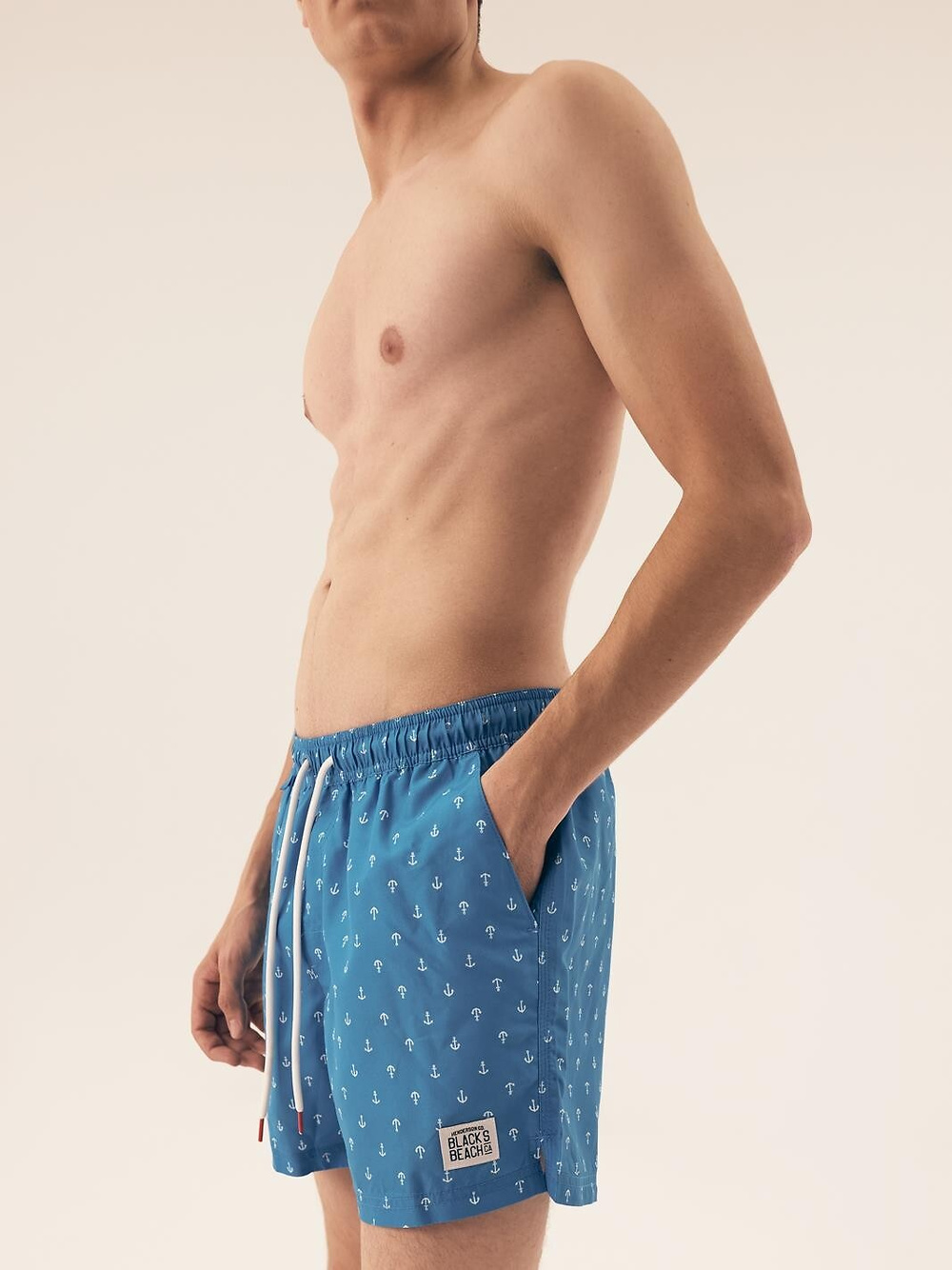 Szorty kąpielowe męskie - wykonane z szybkoschnącej tkaniny - print w kotwice - w pasie gumka i troczek do regulacji obwodu pasa - z kieszeniami - na nogawce ozdobna naszywka - od wewnętrznej strony wszyte slipy z siateczki Skład: 100% poliester