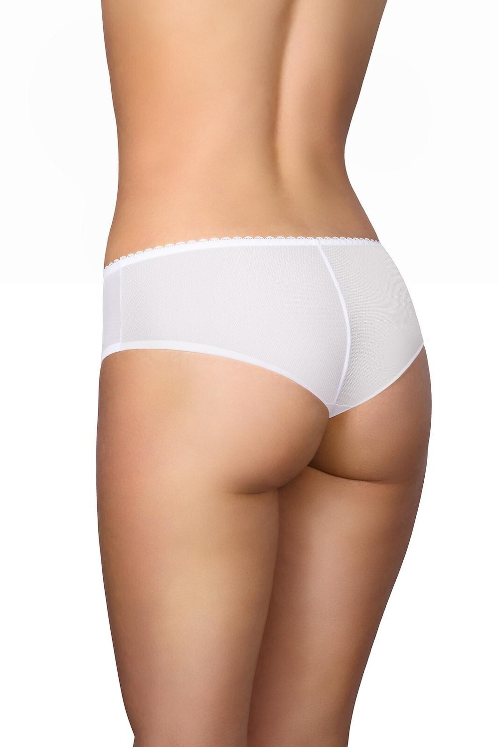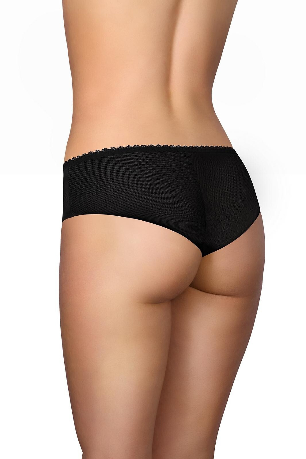 Figi damskie o kroju brazylian - delikatna siateczka w połączeniu z koronką - tył z podwójnej siateczki z pionowym szwem - krój mocno odsłaniający pośladki Skład: 85% poliamid, 15% elastan
