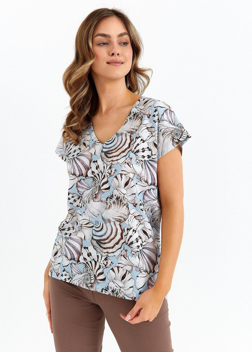Piżama damska - wysokiej jakości bawełna - koszulka z krótkim rękawem - kwiatowy print - dekolt w kształcie litery "V" - spodnie jednolite, z nogawką 3/4 - w pasie gumka Skład: koszulka 100% bawełna; spodnie 95% bawełna, 5% elastan