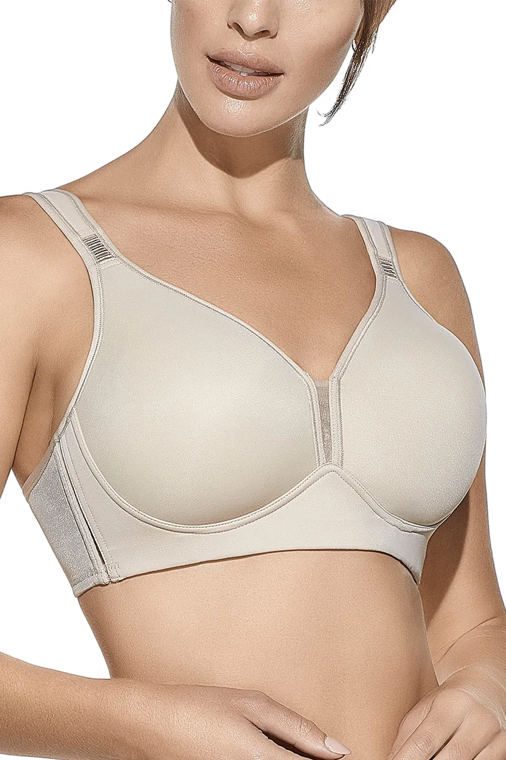 Praktyczność: Model bez fiszbin zapewnia pełen komfort i brak ucisku, nawet przy długim noszeniu. Szerokie, miękko wyściełane ramiączka, nie wpijają się w ramiona. Obniżony pas pod biustem zwiększa stabilność i dobrze rozkłada ciężar, powodując, że biustonosz jest idealny dla większego biustu.