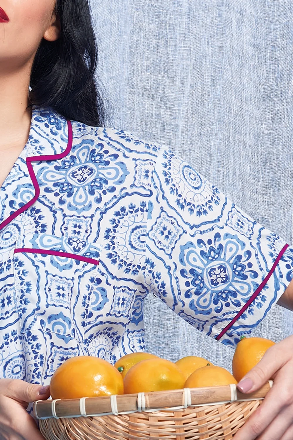 Lekka i przewiewna piżama damska została zaprojektowana z myślą o komforcie oraz pięknym wyglądzie. Klasyczna, rozpinana koszula z krótkim rękawem w połączeniu z szerokimi spodniami typu palazzo tworzy kobiecy i praktyczny komplet, który pokochasz od pierwszego założenia.