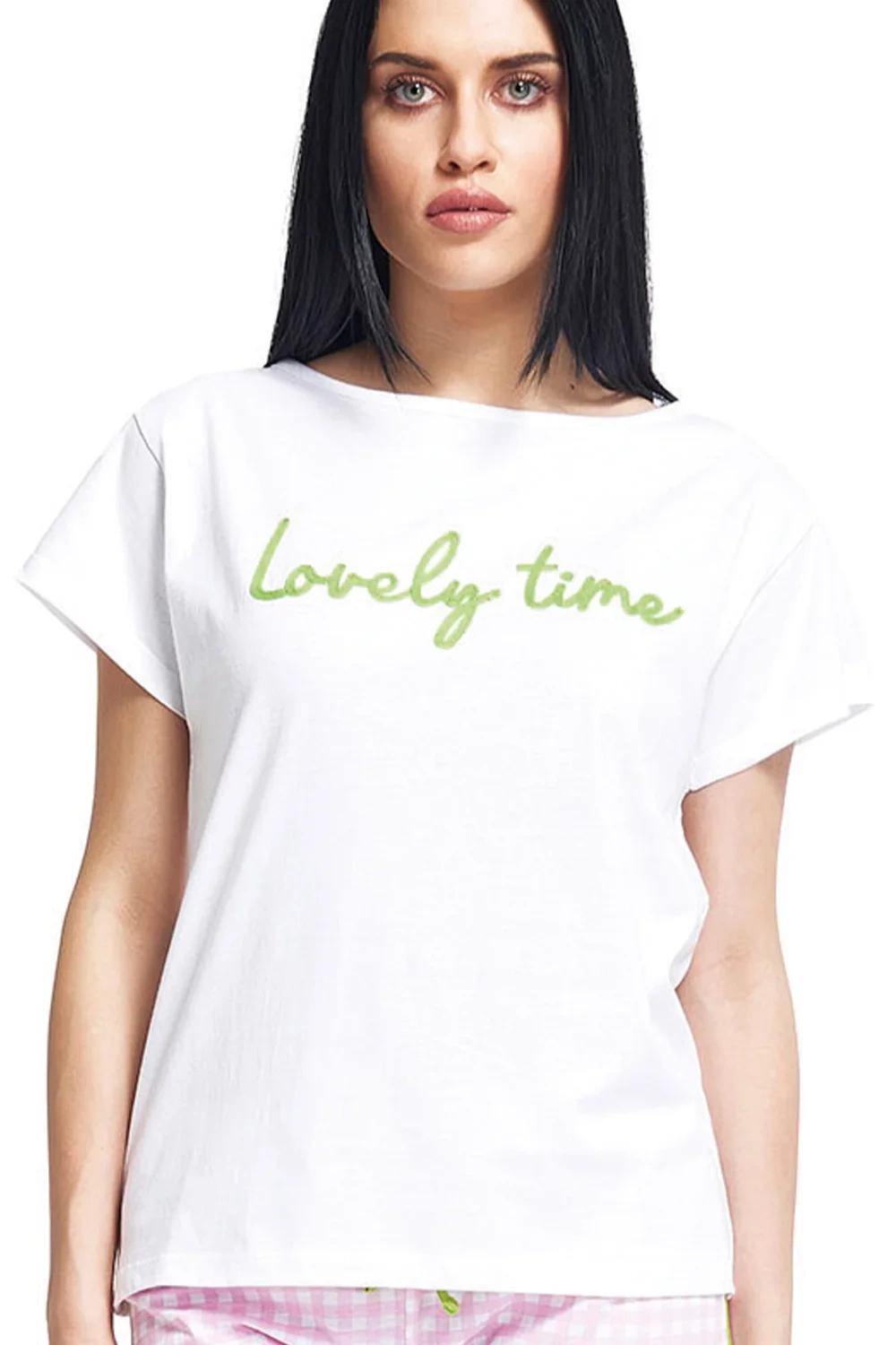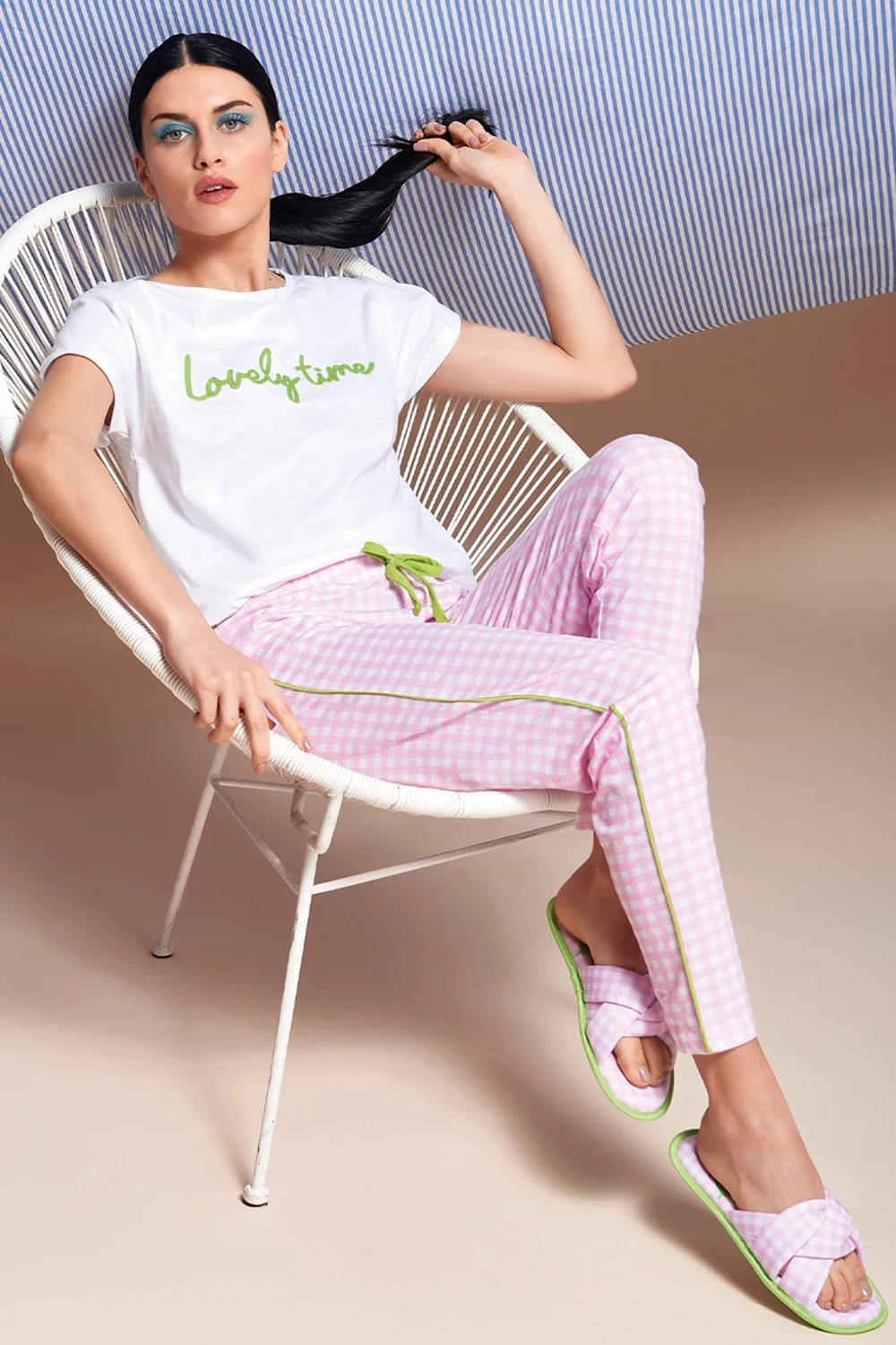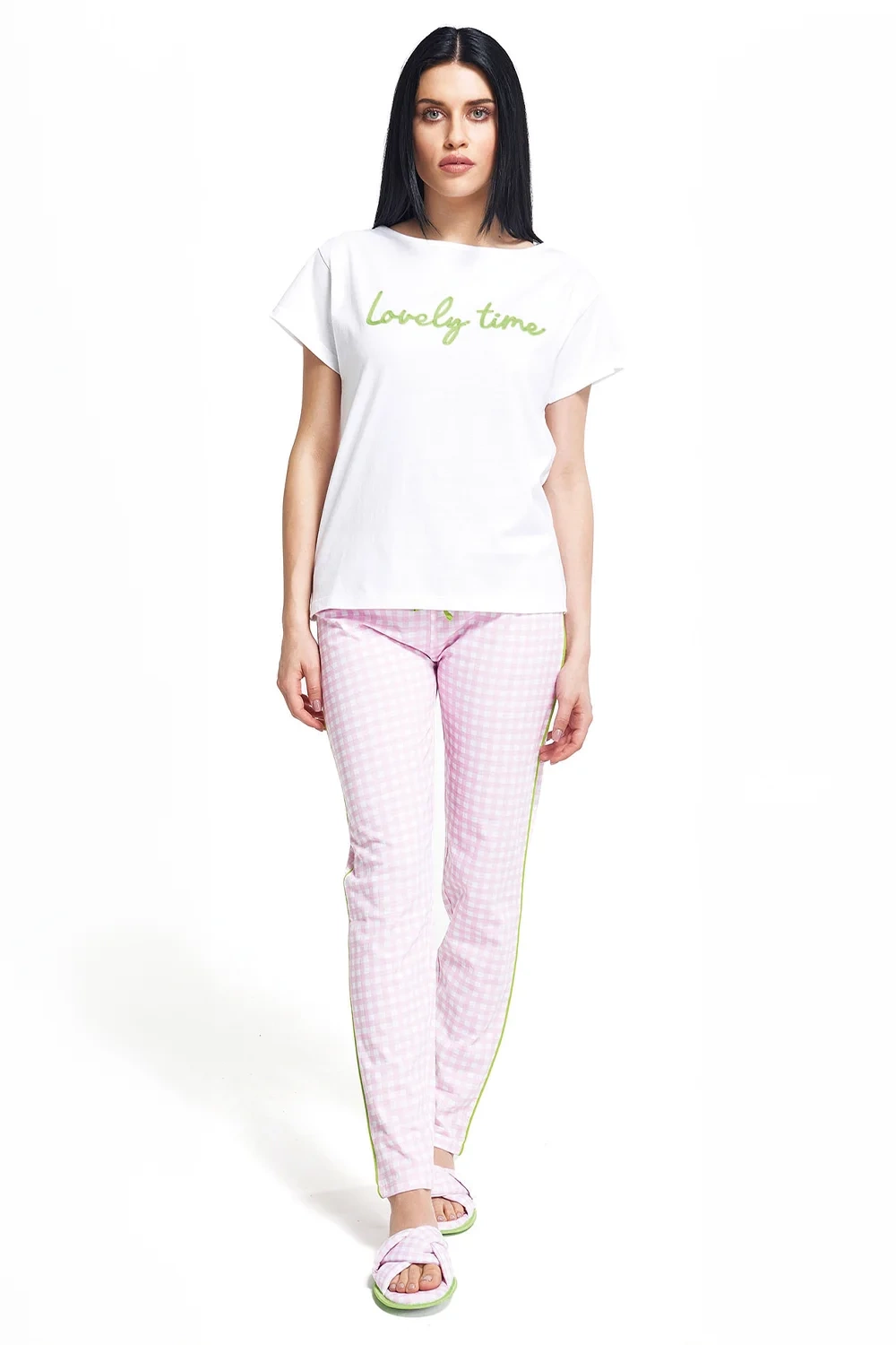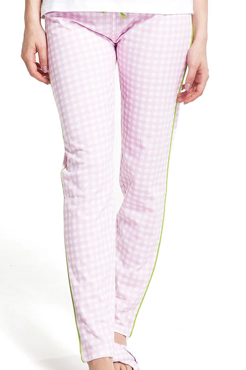 designem. Różowo-biała kratka z limonkową lamówką i haftem zapewniają