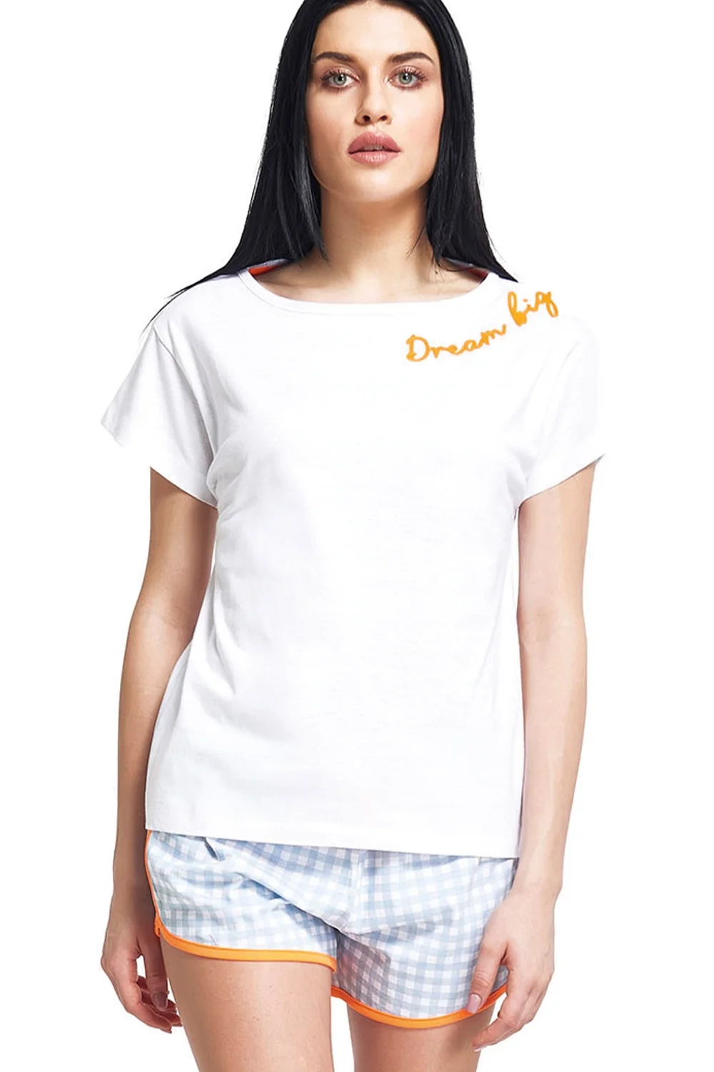 lekka koszulka z haftowanym napisem oraz szorty w kartę z kontrastową lamówką