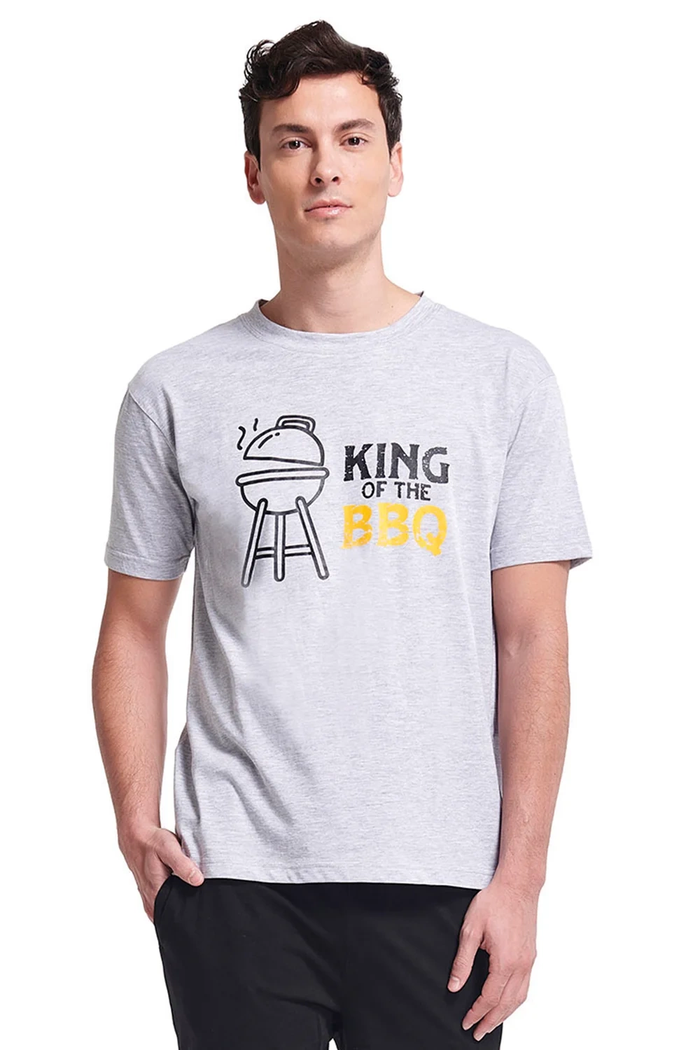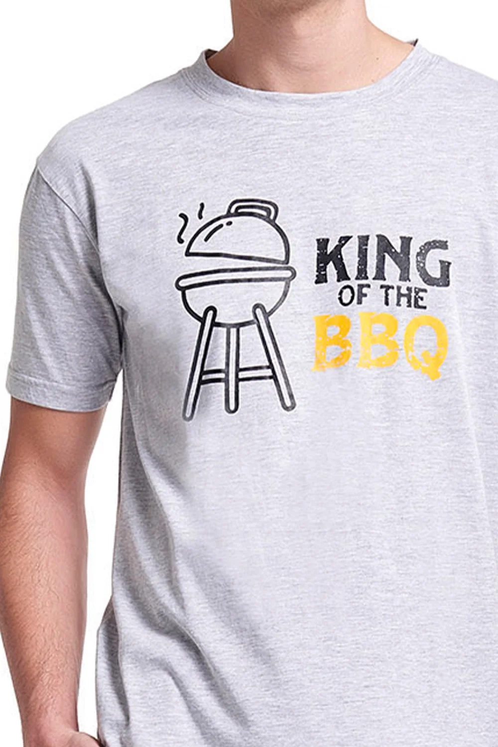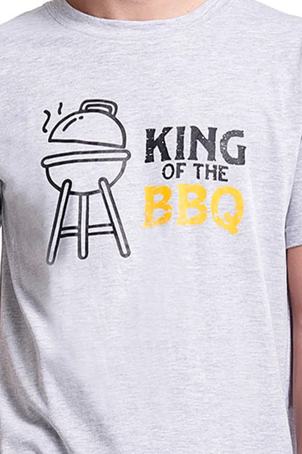 designem. Szara koszulka z nadrukiem „King of the BBQ” oraz czarne, gładkie spodenki to klasyczny