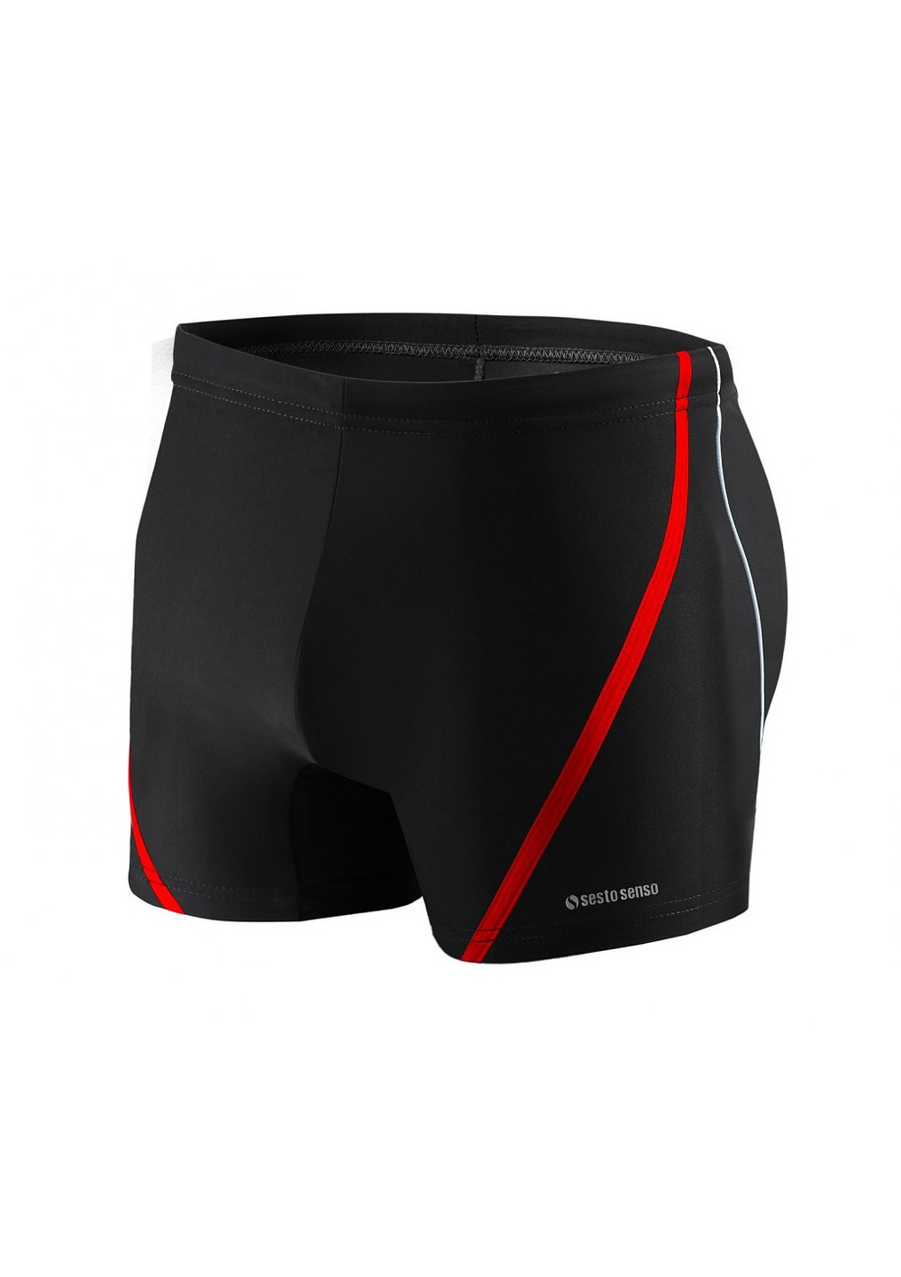 Bokserki kąpielowe- z wysokiej jakości mikrofibry- ozdobione lamówkami w kontrastującym kolorze- w pasie elastyczna gumka- od wewnętrznej strony sznureczek do regulacji obwodu- na nogawce mały nadruk logo Sesto Senso