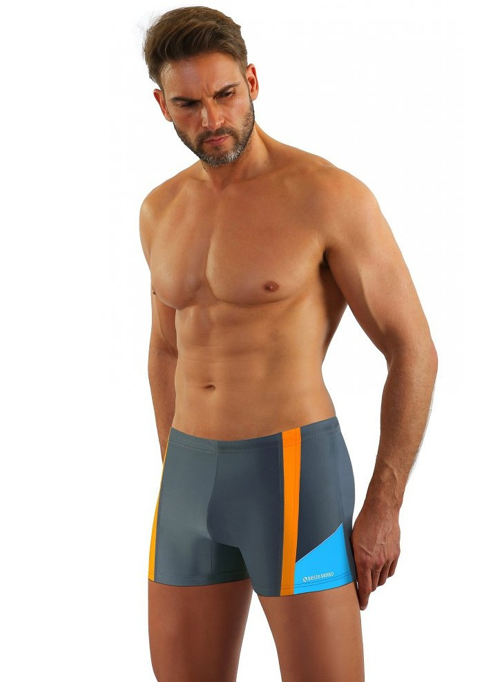Bokserki kąpielowe- z wysokiej jakości mikrofibry, z kontrastującymi wstawkami- w pasie elastyczna gumka, od wewnętrznej strony sznureczek do regulacji obwodu- na nogawce mały nadruk logo Sesto Senso