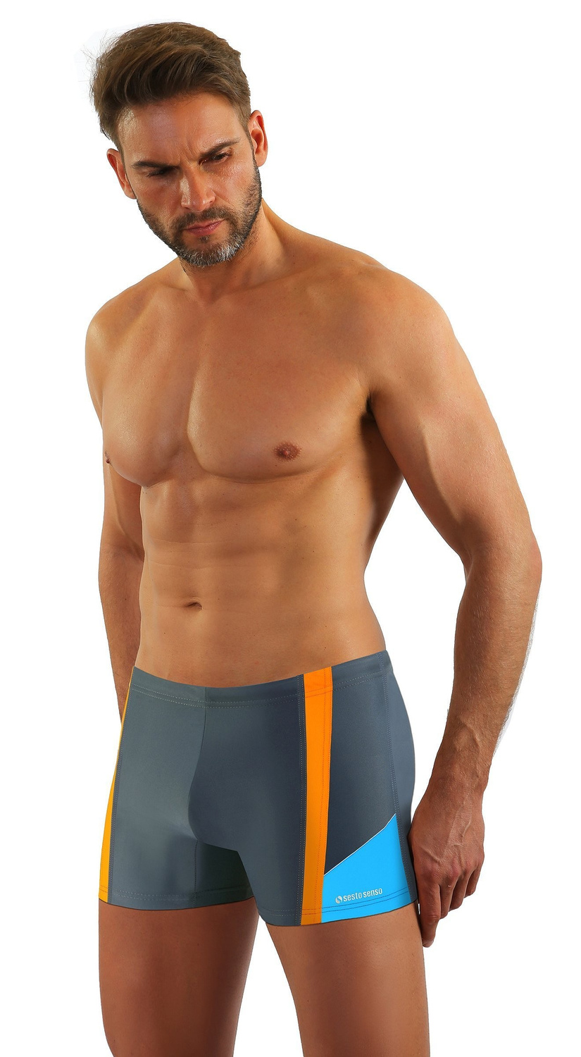 Bokserki kąpielowe- z wysokiej jakości mikrofibry, z kontrastującymi wstawkami- w pasie elastyczna gumka, od wewnętrznej strony sznureczek do regulacji obwodu- na nogawce mały nadruk logo Sesto Senso