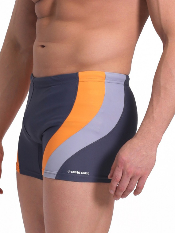 Bokserki kąpielowe- z wysokiej jakości mikrofibry- w pasie elastyczna gumka, od wewnętrznej strony sznureczek do regulacji obwodu- ozdobione wstawkami w kontrastującym kolorze- na nogawce mały nadruk logo Sesto Senso