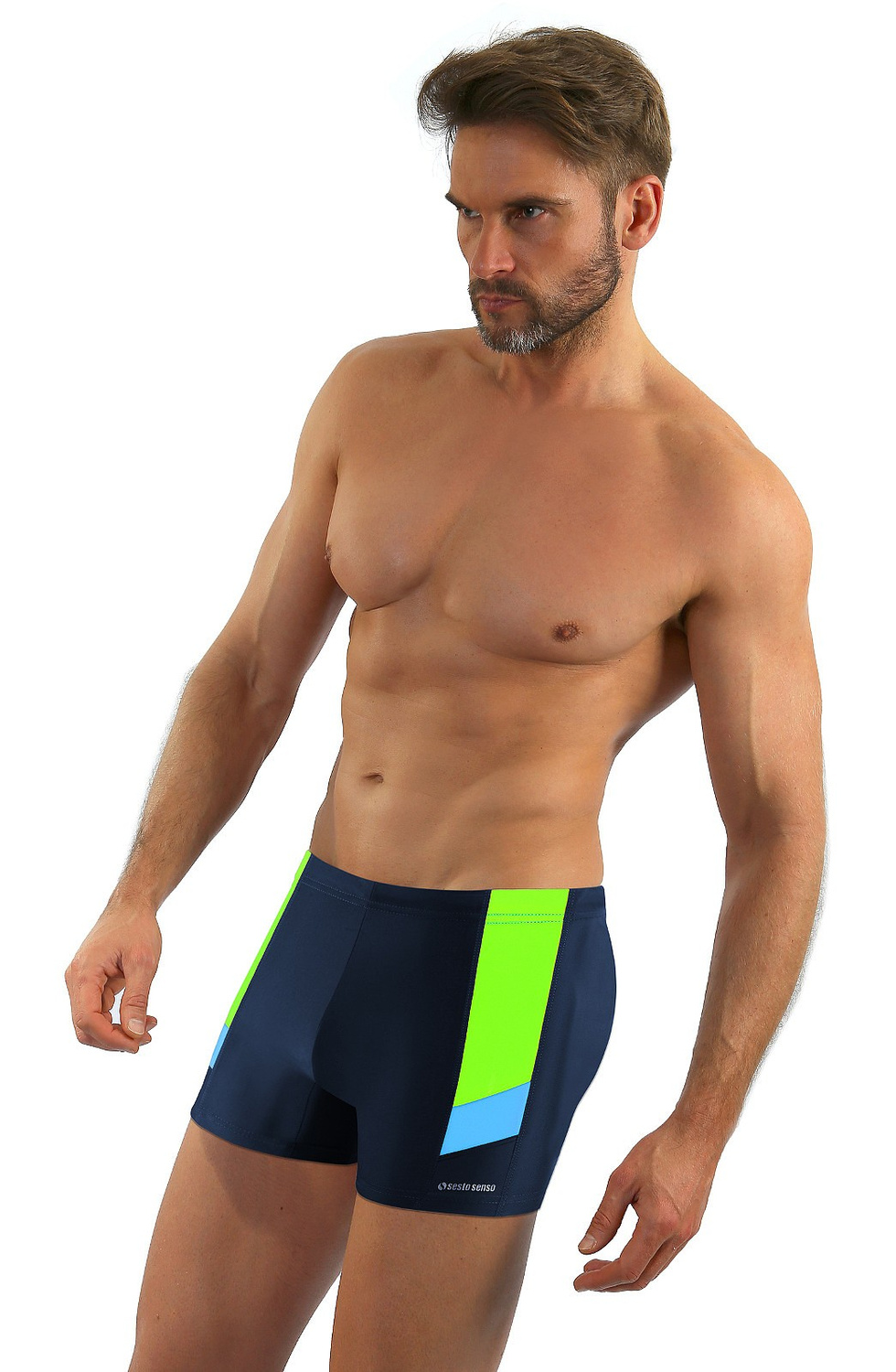 Bokserki kąpielowe- wykonane z wysokiej jakości mikrofibry- zdobione kontrastującymi wstawkami po bokach- w pasie elastyczna gumka, od wewnętrznej strony sznureczek do regulacji obwodu- na nogawce mały nadruk logo Sesto Senso