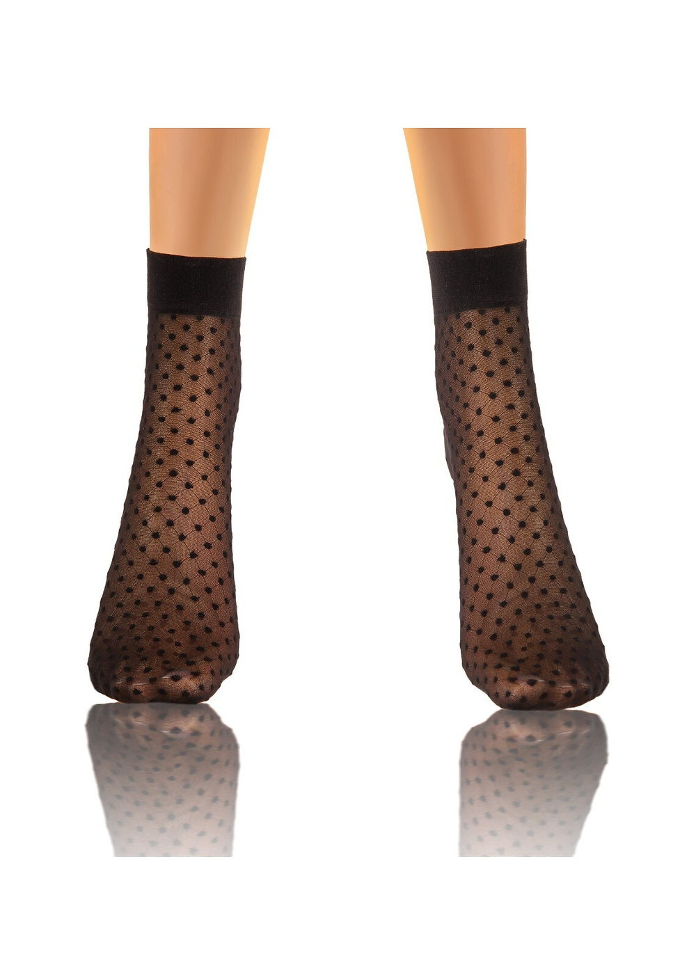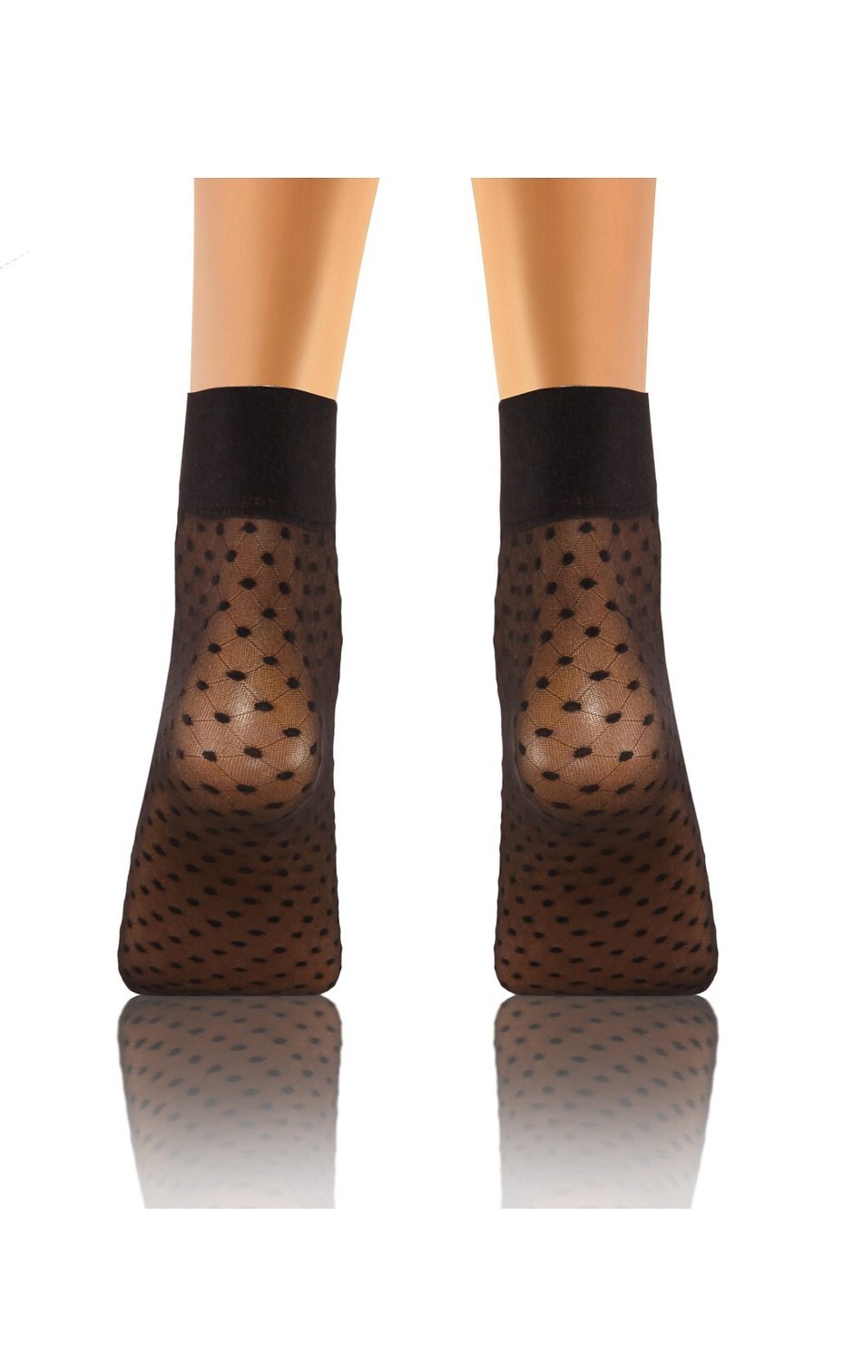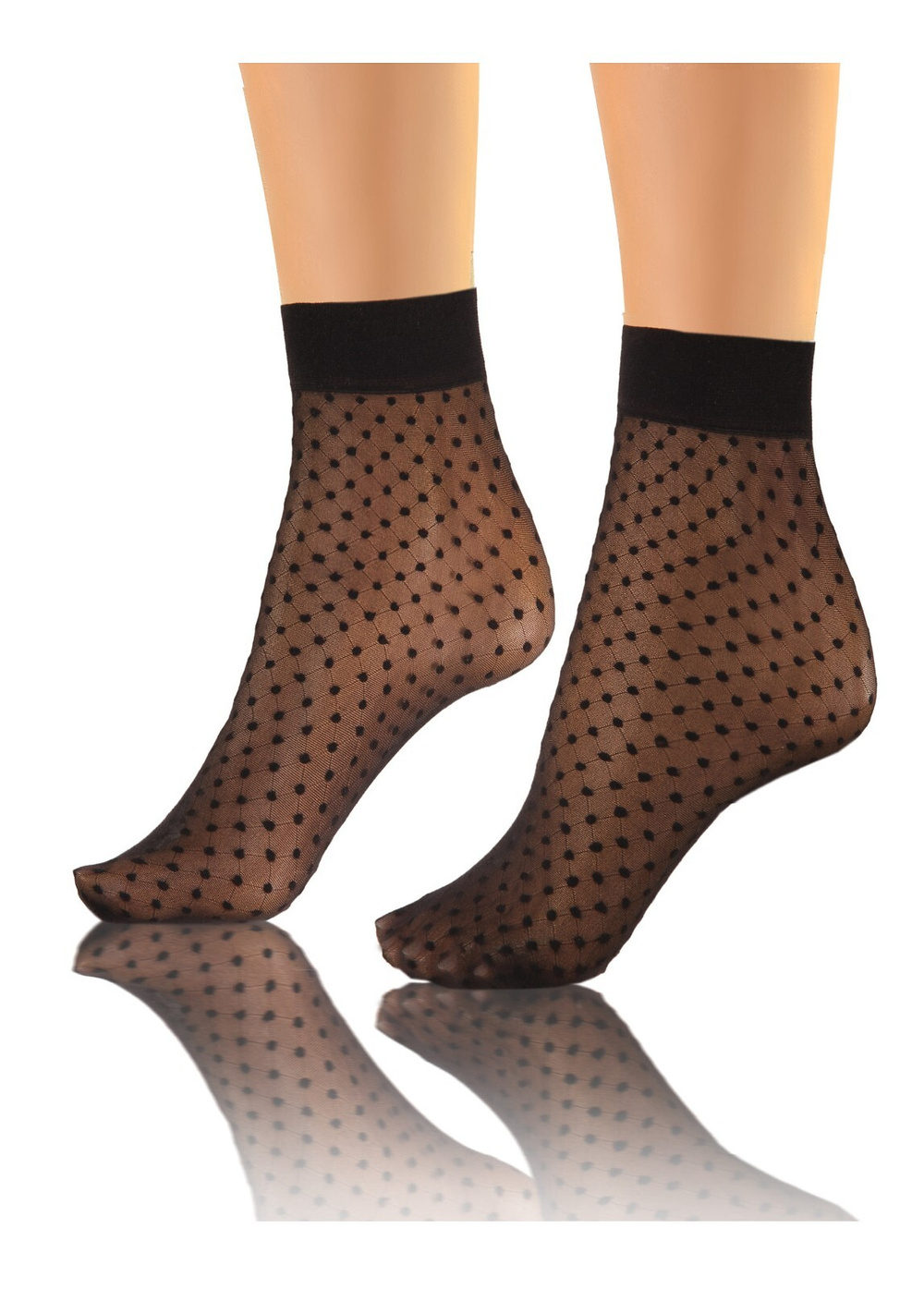Cienkie skarpetki damskie - ozdobione delikatnym wzorem - nieuciskający ściągacz z falbanką której brak na zdjęciu - pakowane po dwie pary w foliowy woreczek Skład: 91% poliamid, 9% elasta