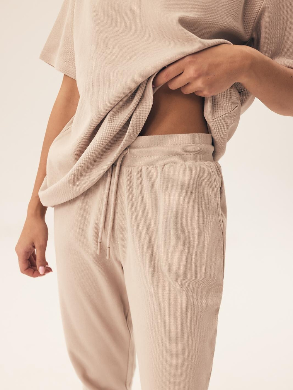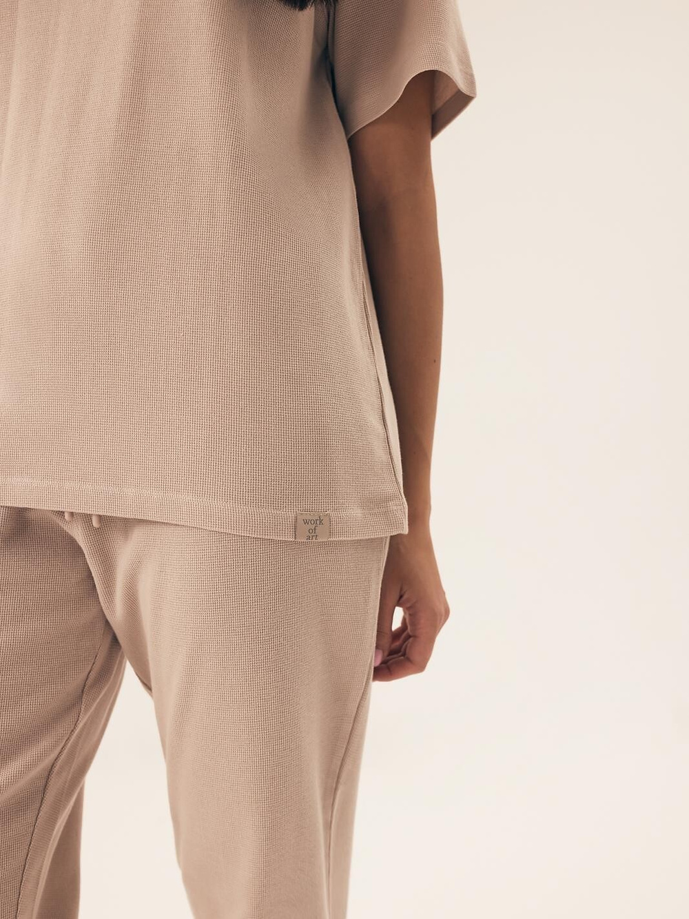Piżama damska - wysokiej jakości bawełna o strukturze "wafla" - koszulka z krótkim rękawem - półokrągły dekolt - u dołu mała naszywka - spodnie długie - w pasie szeroka guma obszyta prążkowaną dzianiną z troczkiem do regulacji obwodu pasa - na biodrach wygodne kieszenie - nogawki zakończone ściągaczem   Skład: 100% bawełna