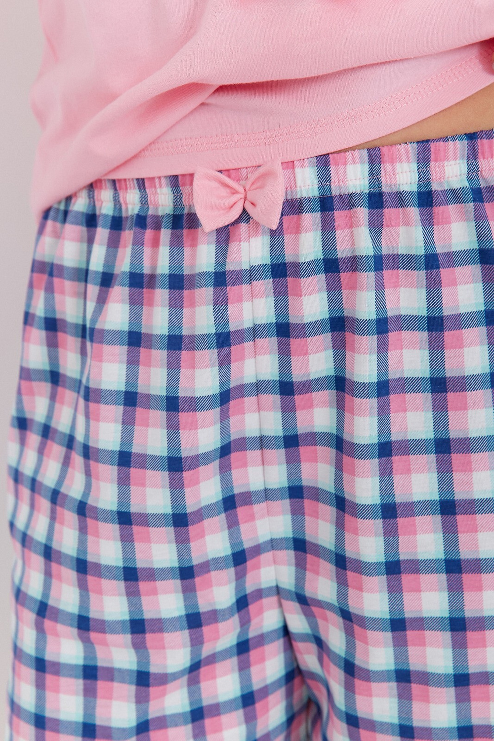 Letnia piżama damska - jednolita koszulka z krótkim rękawem - dekolt w kształcie litery "V" - spodenki krótkie, wzór w kratkę - luźny wygodny krój - w pasie gumka i ozdobna kokardka Skład: 100% bawełna