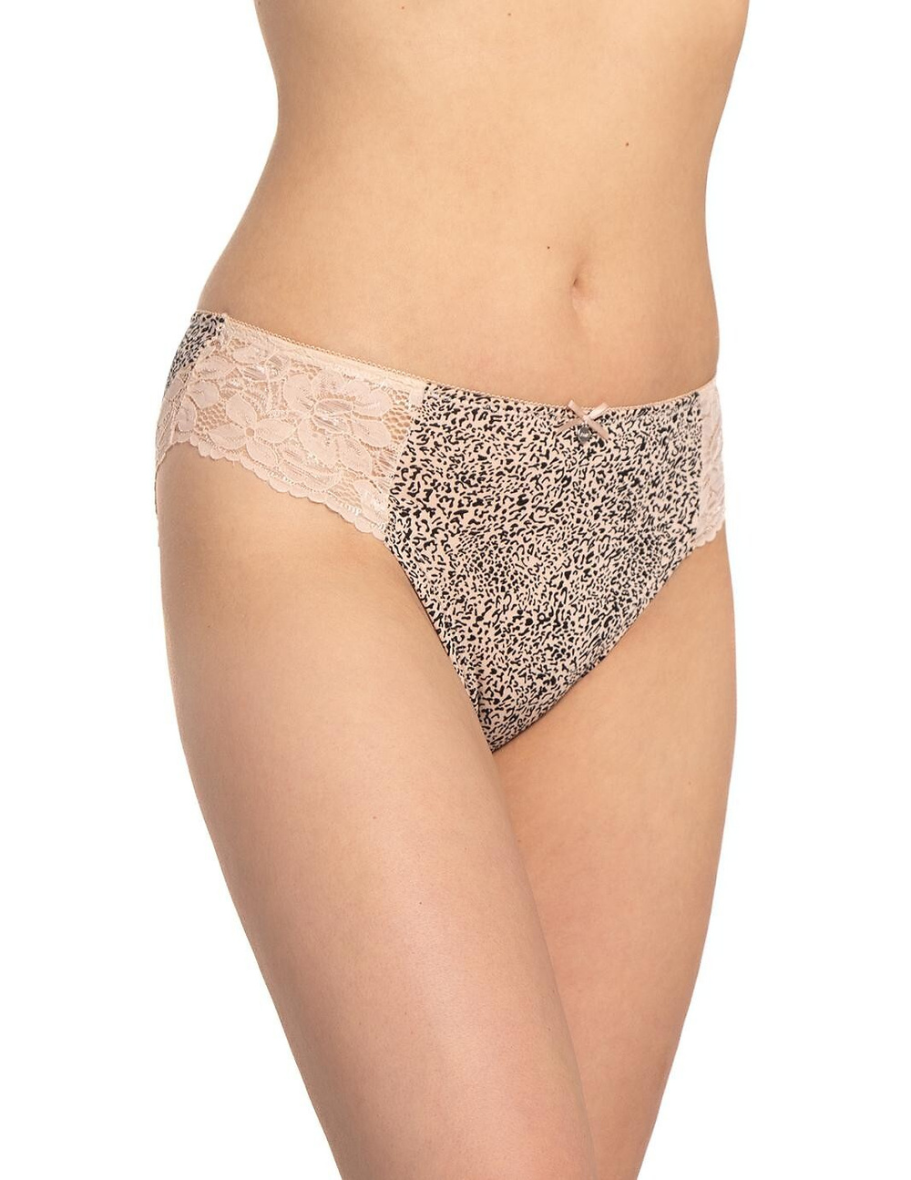 Figi damskie o kroju bikini - wysokiej jakości bawełna - boki i tył z koronkowymi wstawkami - w pasie satynowa kokardka z zawieszką z logo LAMA - pakowane w pudełko po dwie sztuki Skład: 95% bawełna, 5% elastan