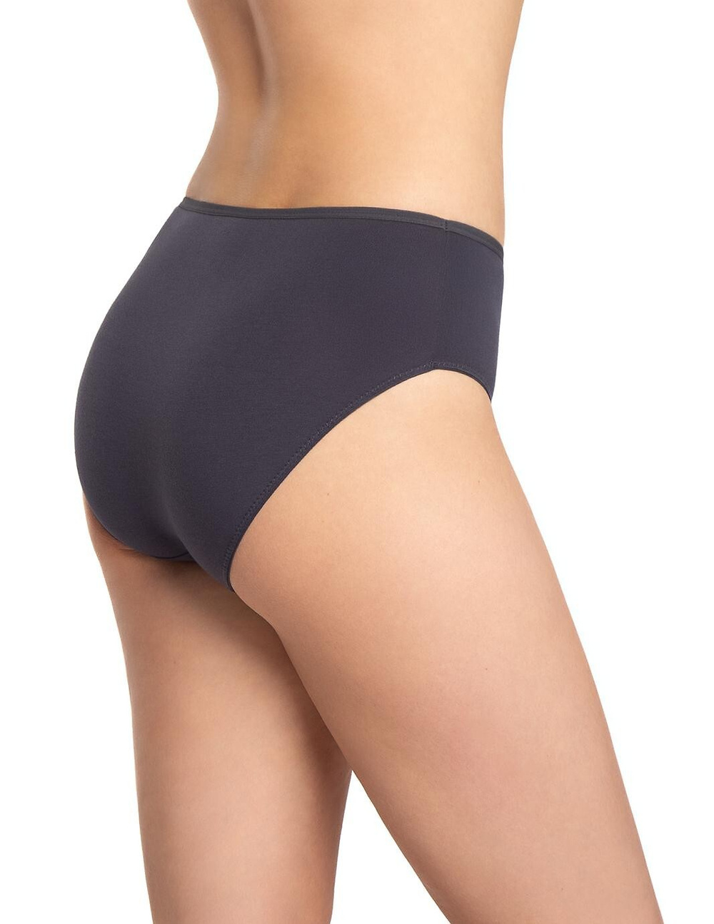 Bawełniane figi damskie - klasyczny krój, bikini - w pasie płaska gumka z kokardką - biodra lekko zabudowane - pakowane w foliowy woreczek po trzy sztuki w kolorze beżowym, czarnym i grafitowym Skład: 95% bawełna, 5% elastan