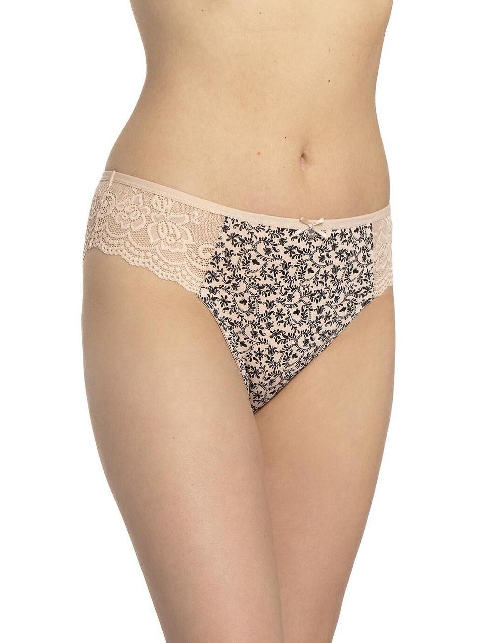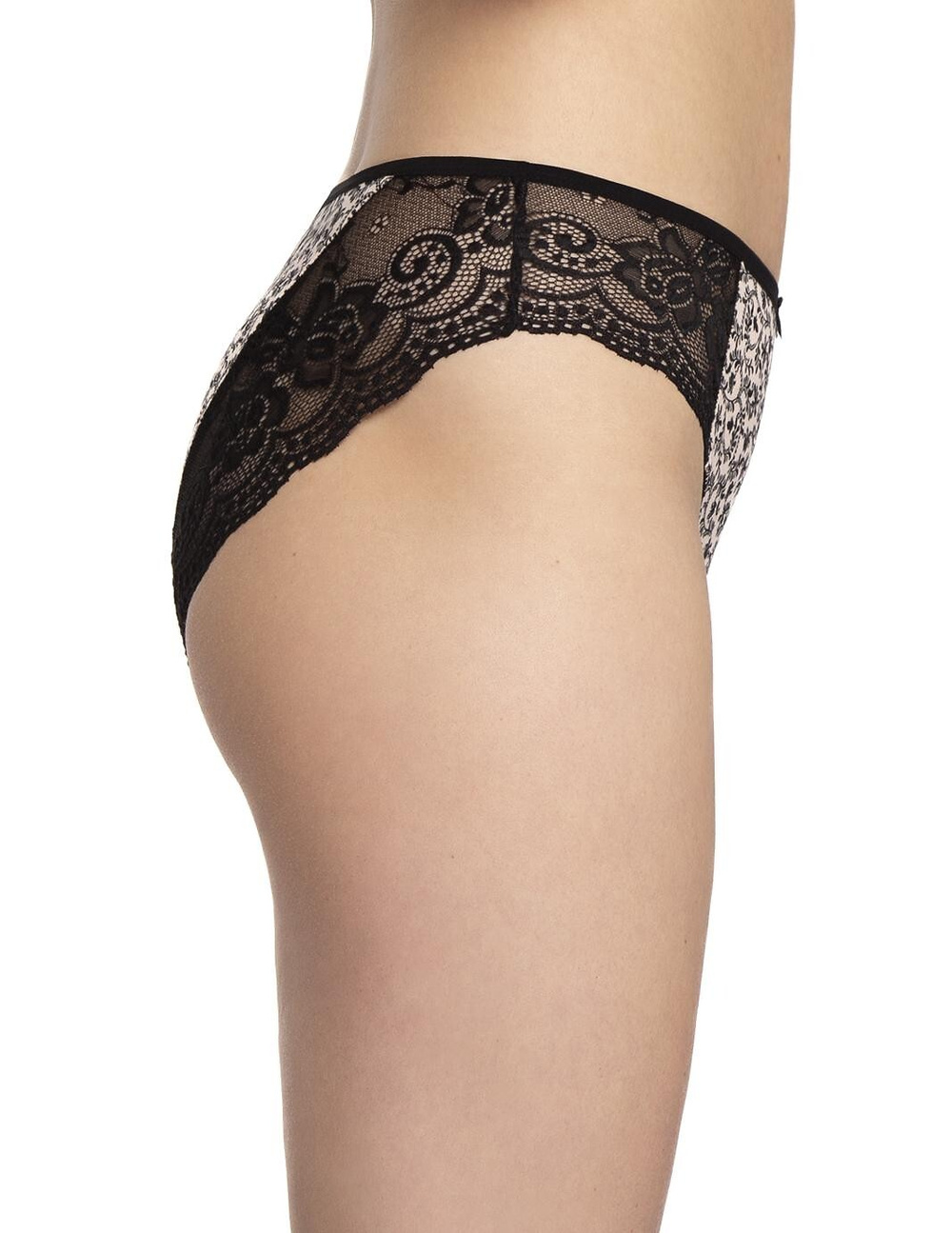 Figi damskie o kroju bikini - wysokiej jakości bawełna - boki i tył z koronkowymi wstawkami - w pasie płaska gumka i satynowa kokardka z zawieszką z logo LAMA - pakowane w pudełko po dwie sztuki Skład: 95% bawełna, 5% elastan