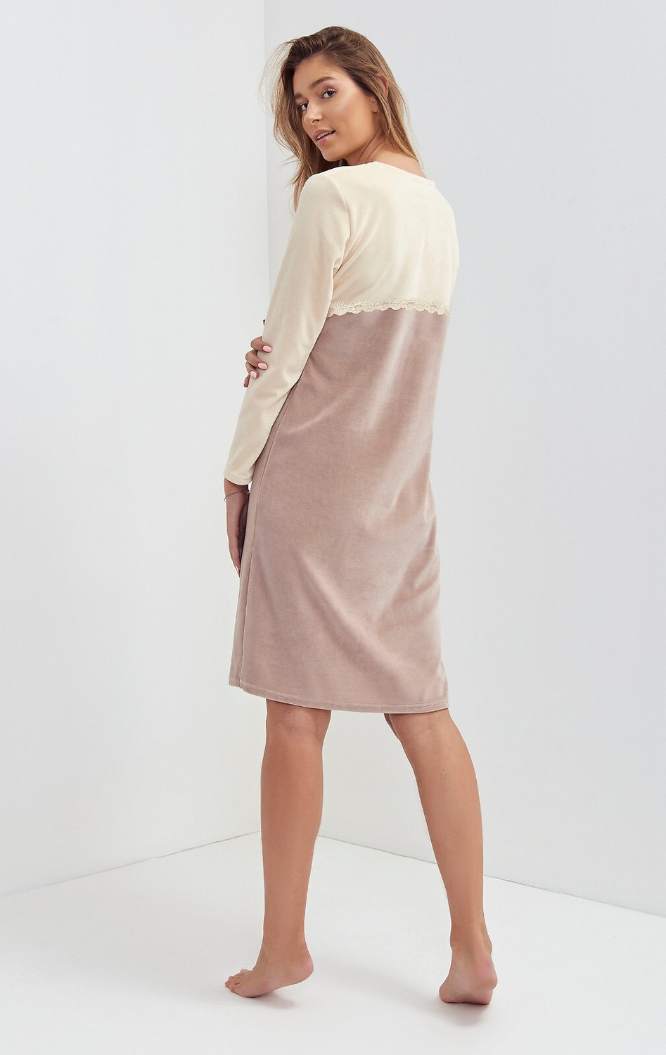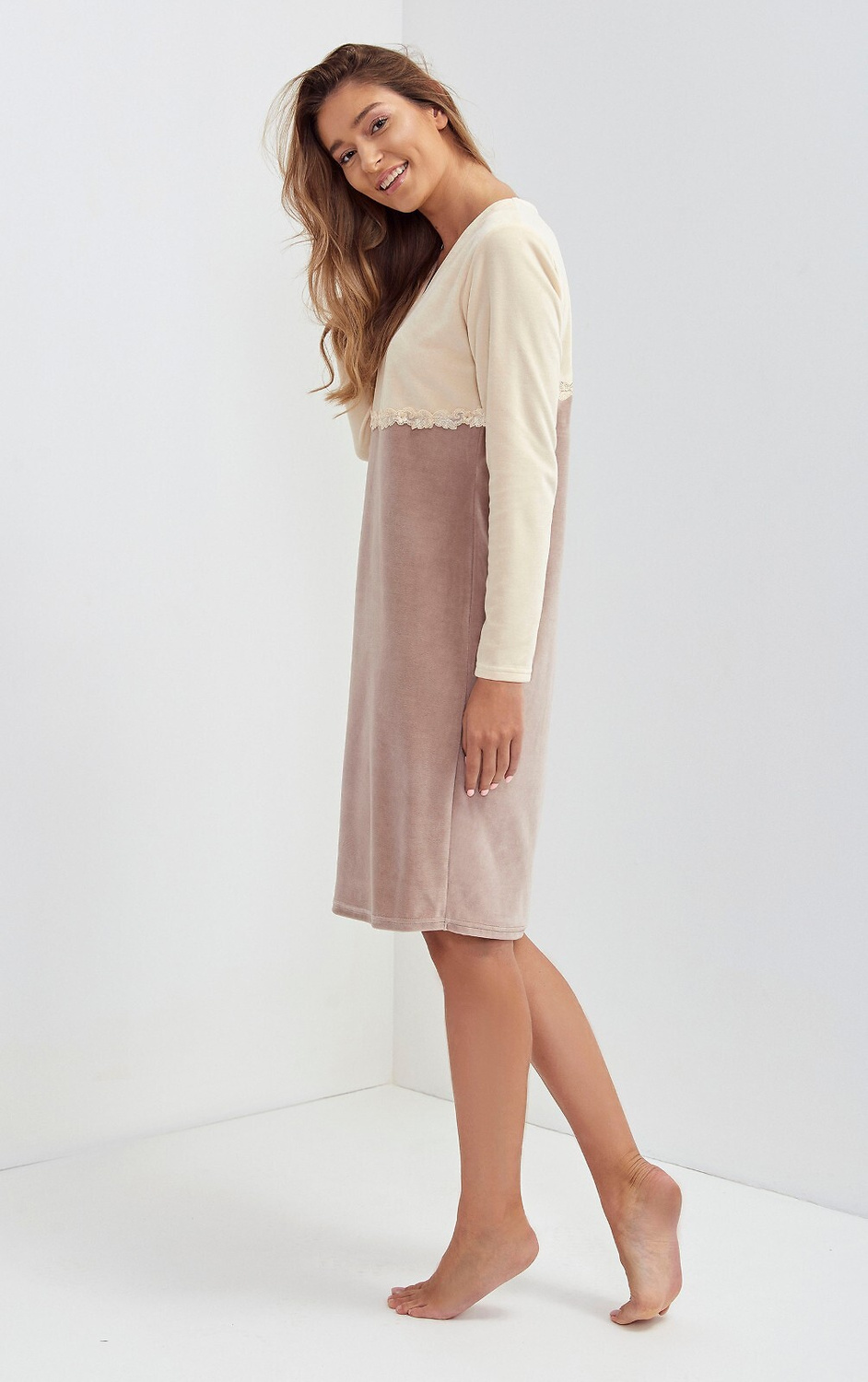 Koszula damska - wysokiej jakości miły, miękki welur - długi rękaw - dekolt typu "V" - na wysokości klatki piersiowej efektowna ozdobna taśma z kwiatowym printem - długość do kolan Skład: 80% bawełna, 20% poliester