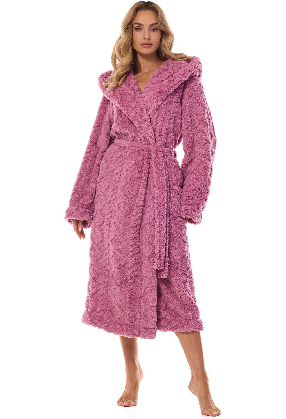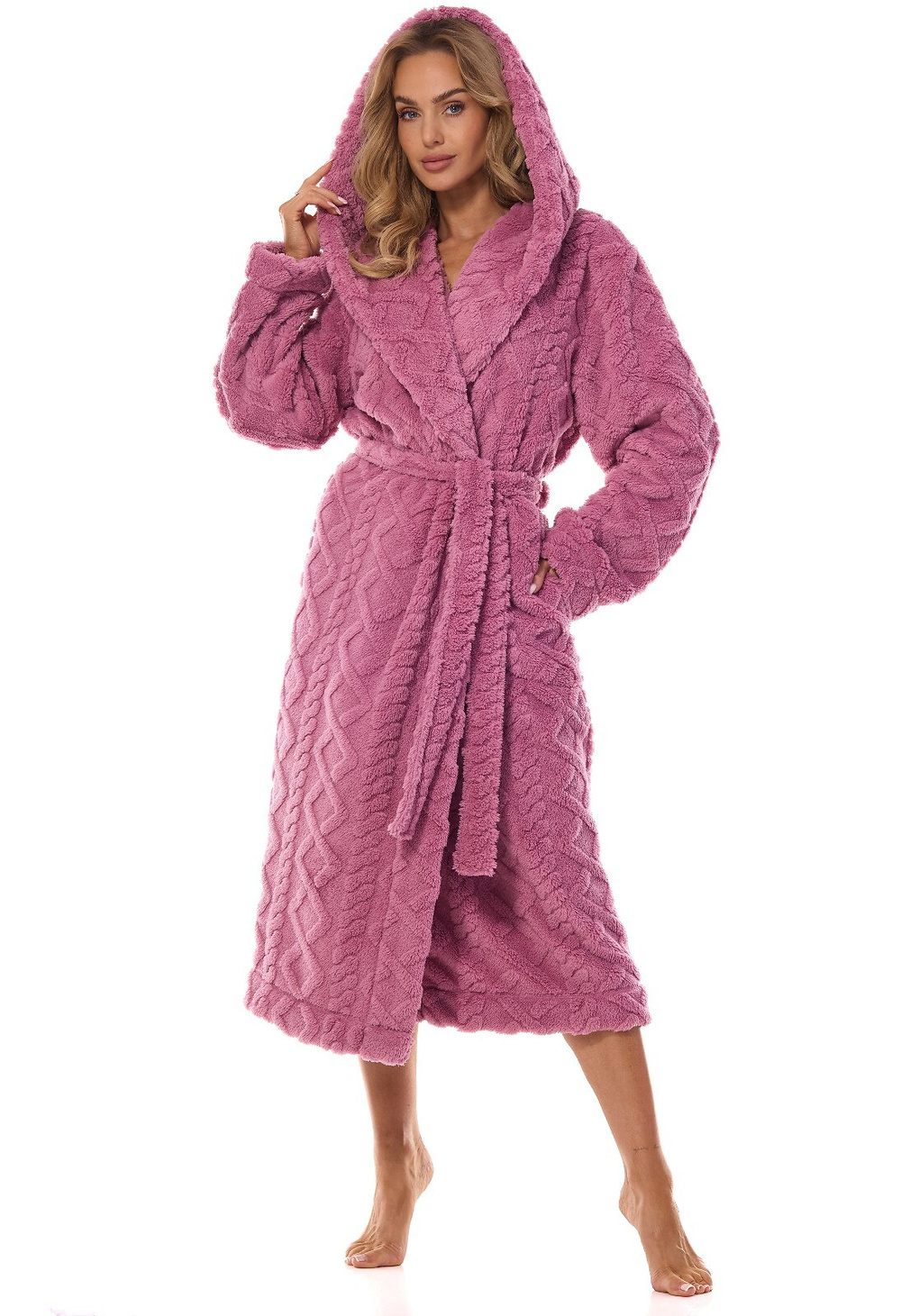 Długi szlafrok damski z kapturem - miękka dzianina z wytłaczanym, wypukłym wzorem - długi rękaw - wiązany w pasie - na biodrach wygodne kieszenie Skład: 100% poliester