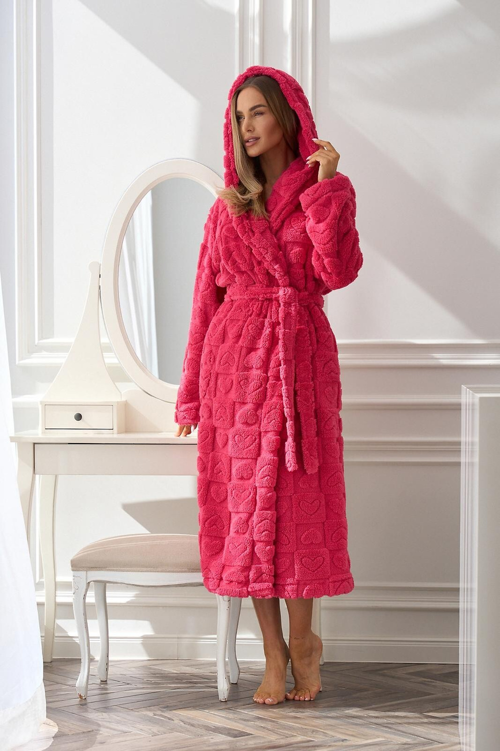 Długi szlafrok damski z kapturem - miękka dzianina z wytłaczanym, wypukłym wzorem w serca - długi rękaw - wiązany w pasie - na biodrach wygodne kieszenie Skład: 100% poliester