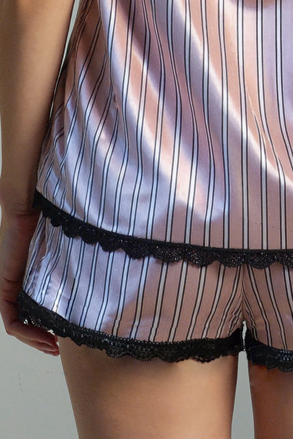Stylowy design – Delikatny połysk satyny, pionowe prążki i subtelna koronka nadają kompletowi elegancki i kobiecy wygląd. Kokardka z przodu spodenek podkreśla uroczą stylistykę.