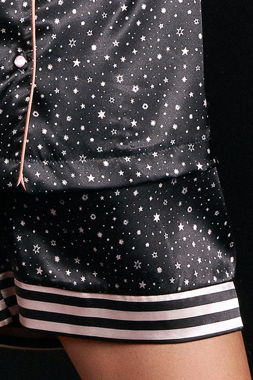 Stylowy design – Delikatny połysk tkaniny, niesamowity print w gwiazdki oraz dopasowane wykończenie w paski nadają kompletowi elegancki i kobiecy wygląd. Szorty w tym samym stylu z gumką w pasie.