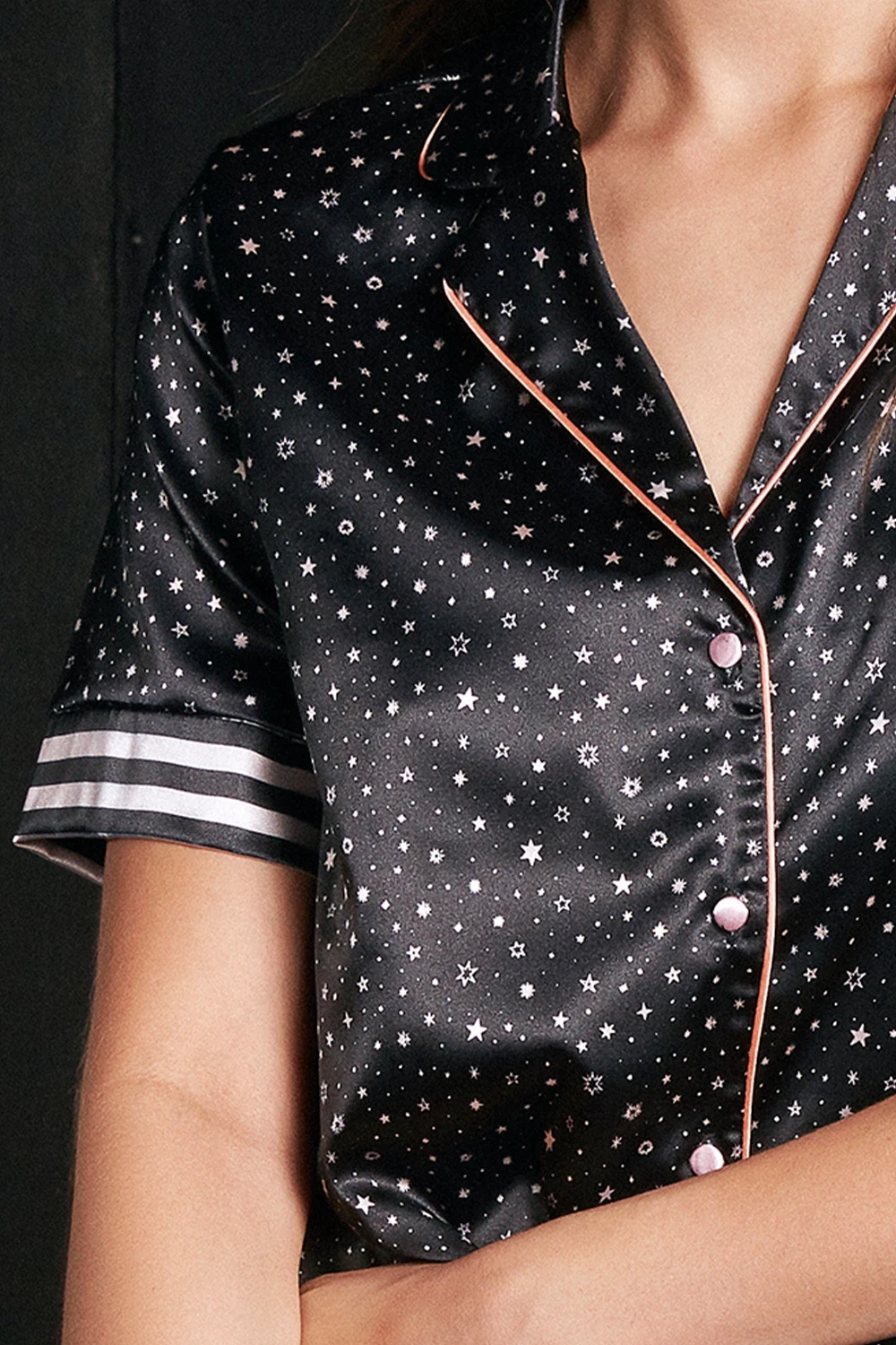 Koszulowa piżama damska z satyny w gwiazdki D1101, czarna