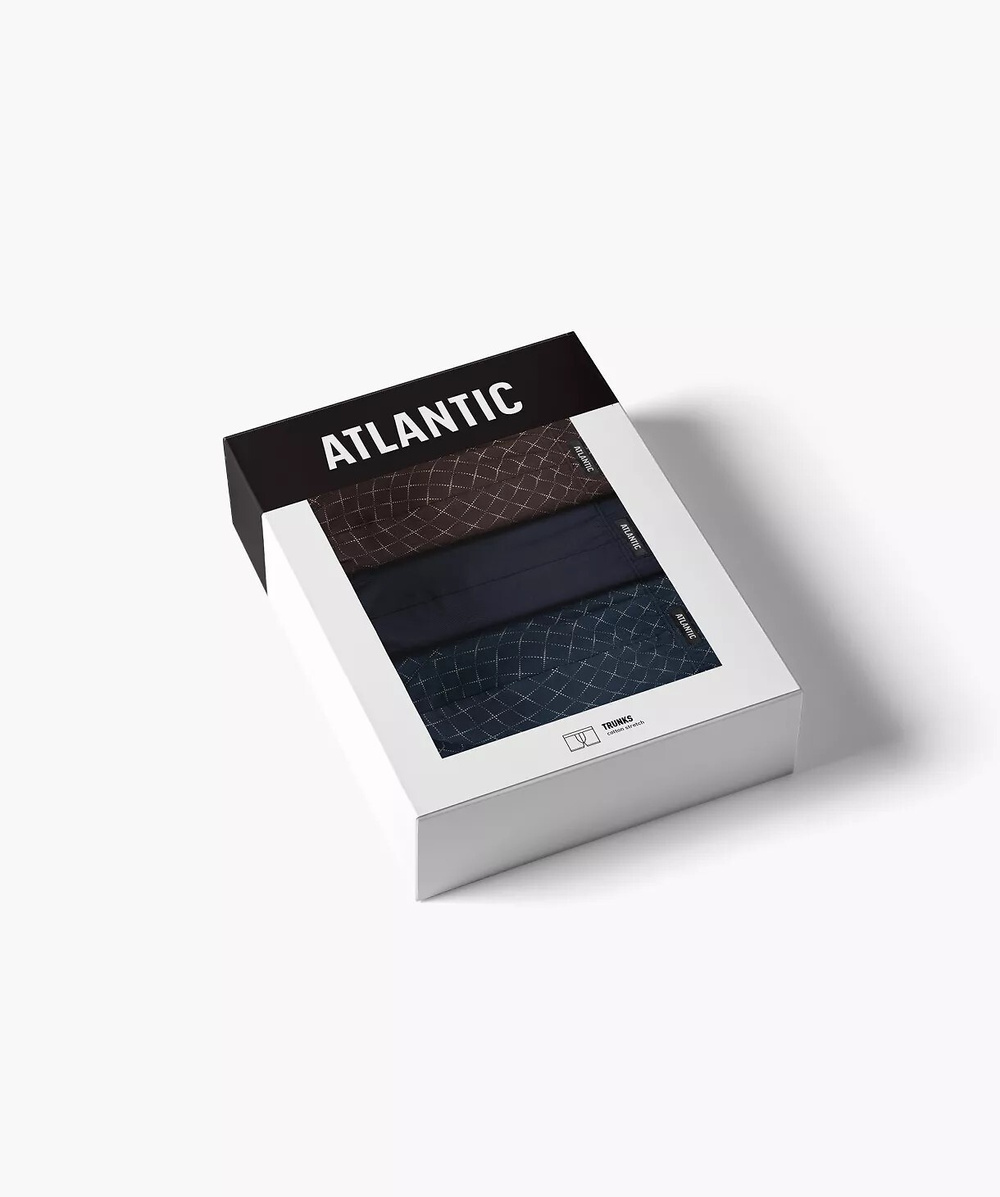 Bokserki męskie - wysokiej jakości bawełna - dwie pary wzorzyste i jedne gładkie - klasyczny krój - w pasie gumka w tunelu z naszywką ATLANTIC - pakowane w pudełko po 3 sztuki Skład: 95% bawełna, 5% elastan