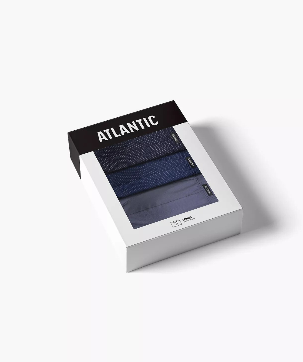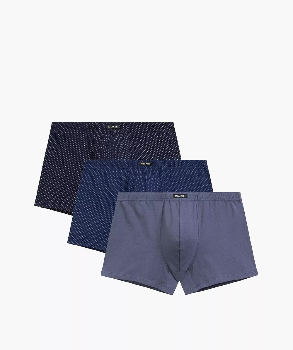 Bokserki męskie - wysokiej jakości bawełna - dwie pary wzorzyste i jedne gładkie - klasyczny krój - w pasie gumka w tunelu z naszywką ATLANTIC - pakowane w pudełko po 3 sztuki Skład: 95% bawełna, 5% elastan