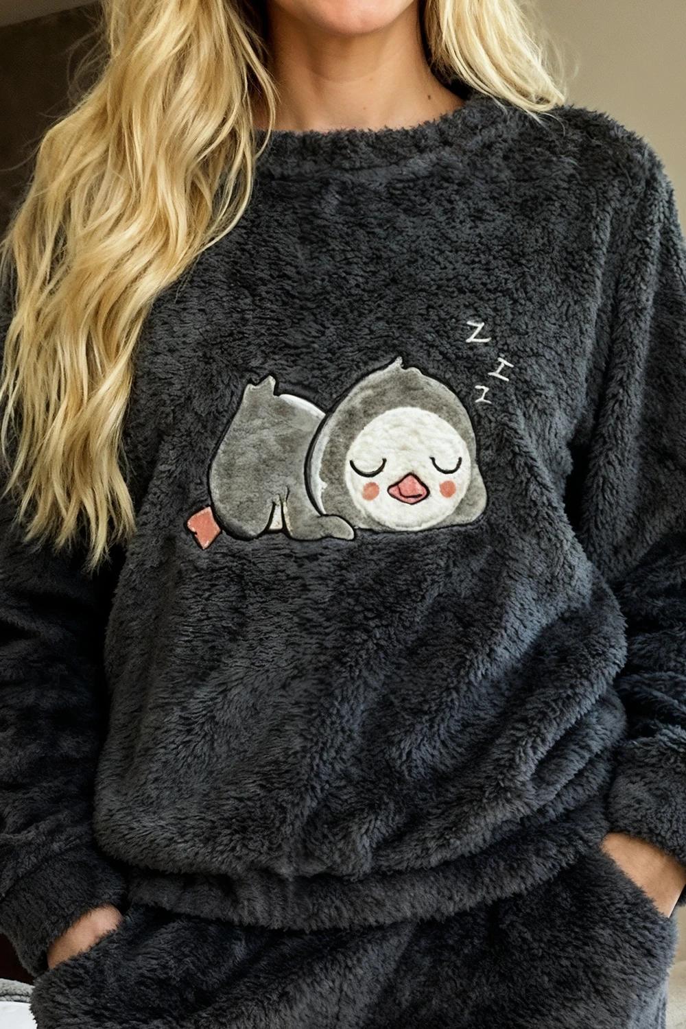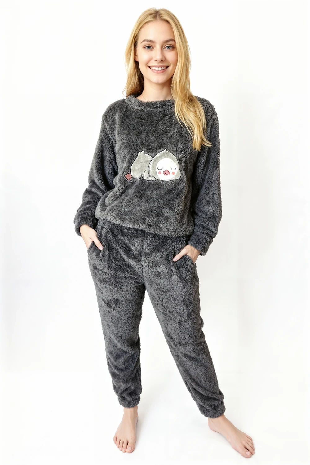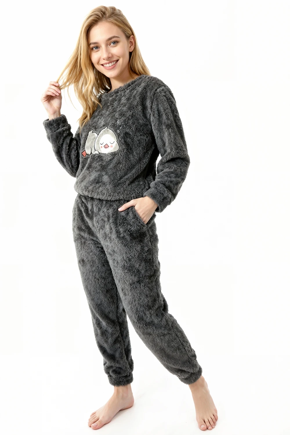 Ciepła miękka damska piżama z polaru soft słodka PINGWIN, grafit