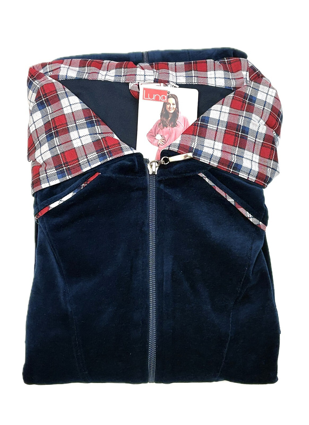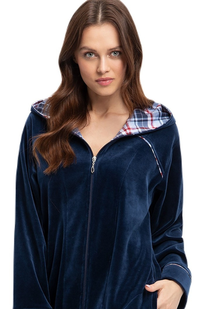 Szlafrok damski z kapturem - miły, miękki w dotyku - zapinany na zamek - na wysokości bioder wygodne kieszenie - mankiety, kieszenie i kaptur obszyte materiałem w kratkę Skład: 82% bawełna, 18% poliester