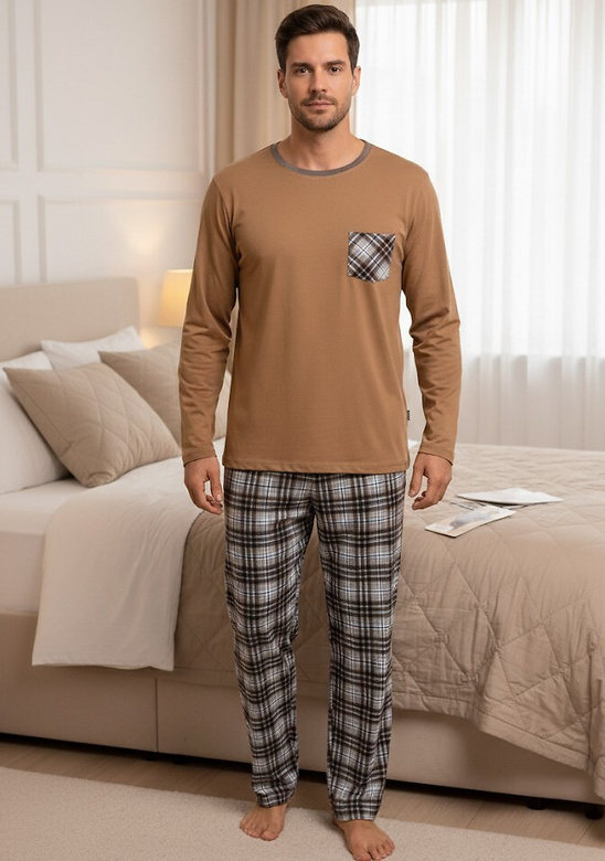 Bawełniana piżama męska - koszulka z długim rękawem - dekolt okrągły - na wysokości piersi naszyta kieszonka - spodnie długie, wzór w kratkę - piżama w kolorze brązowym ma taką kieszonkę jak modele w innych kolorach Skład: 100% bawełna