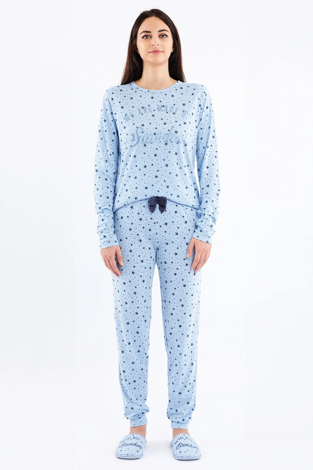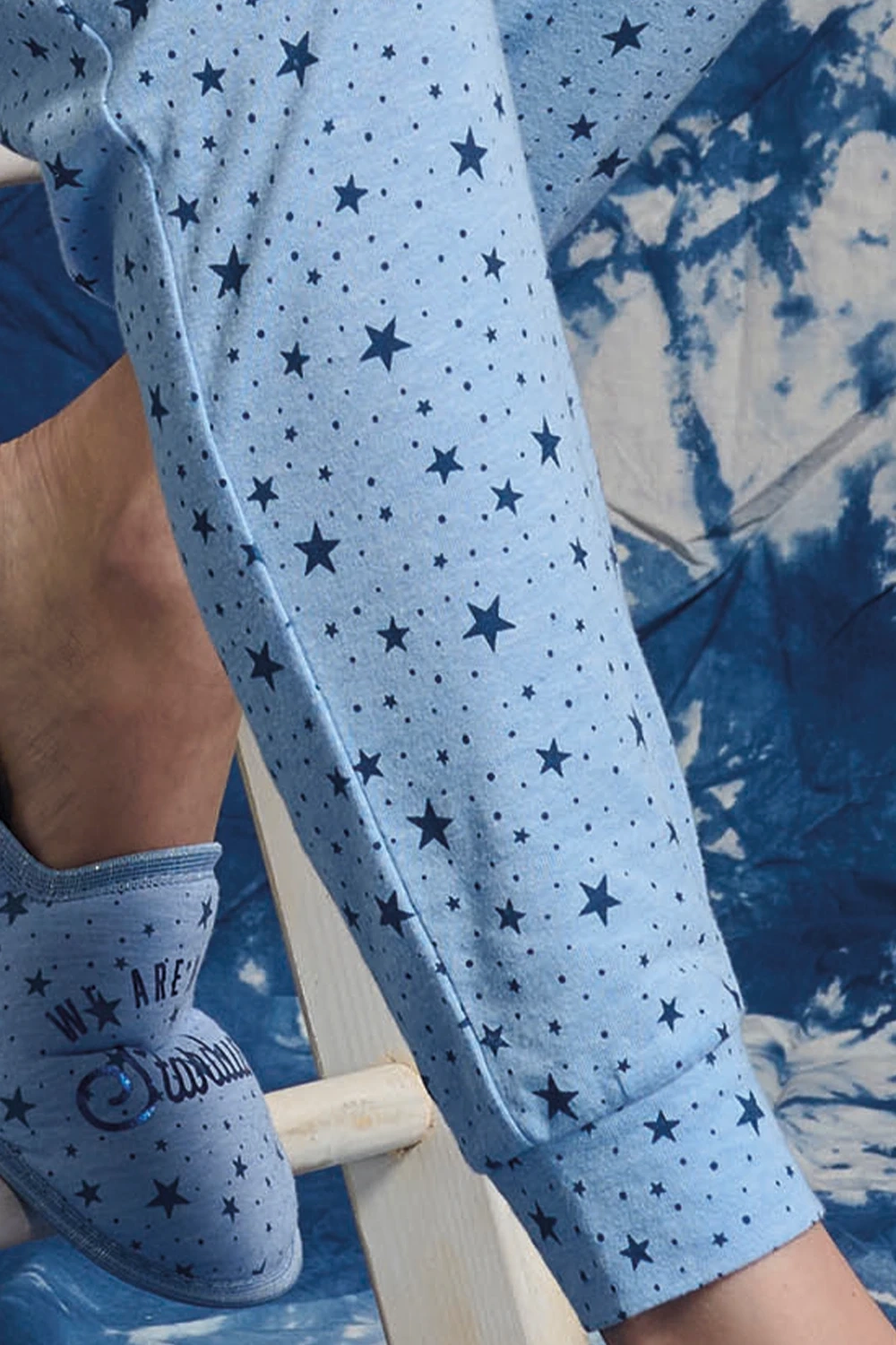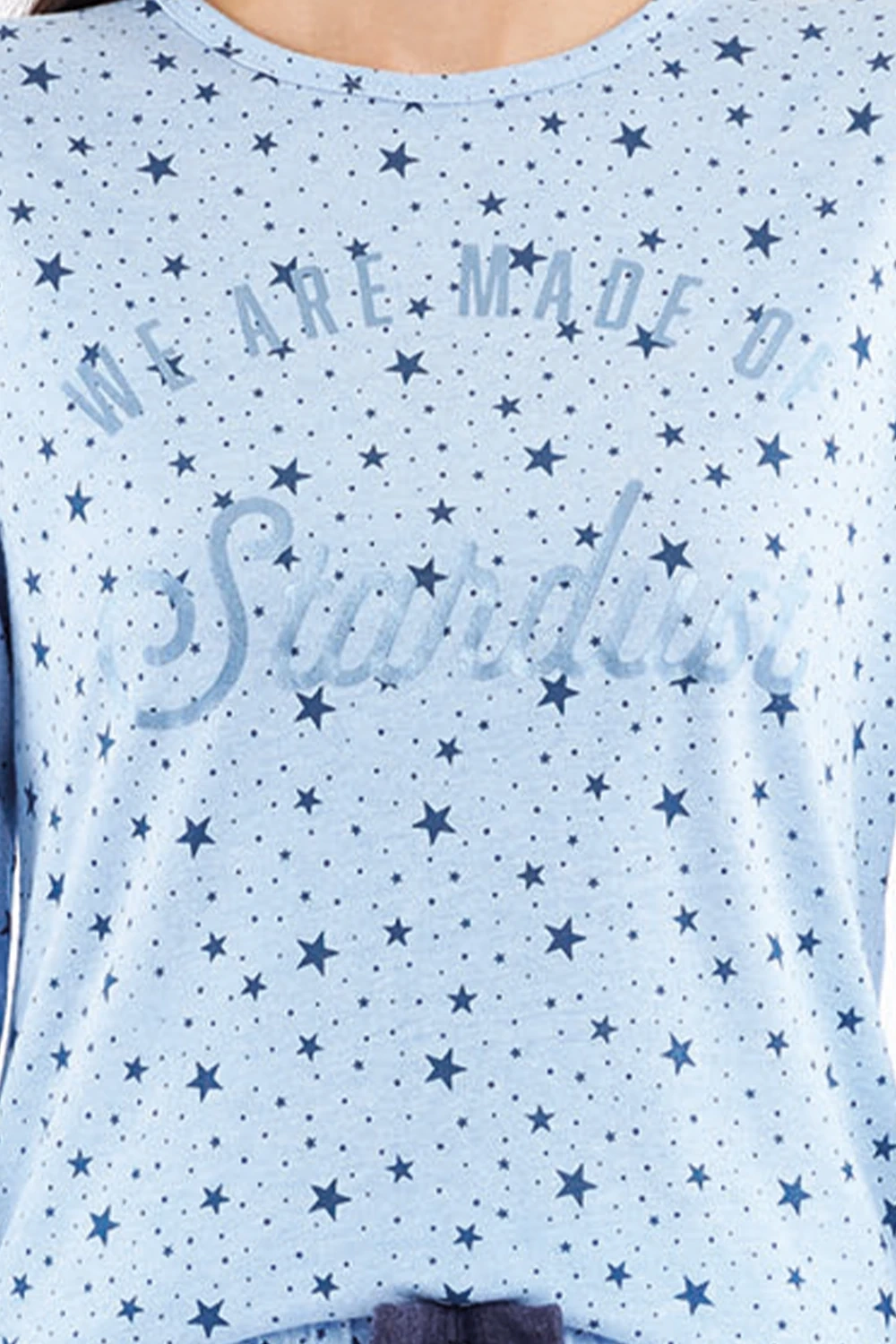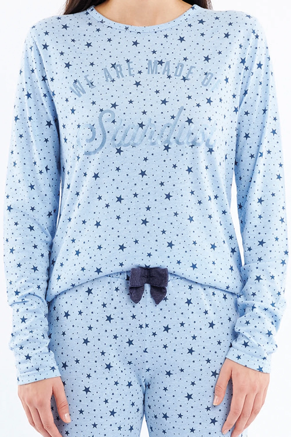 Modny design - Całość w jasnoniebieskiej tonacji ze spójnym wzorem w gwiazdki i eleganckim, metalizowanym napisem tworzy ponadczasowy komplet.