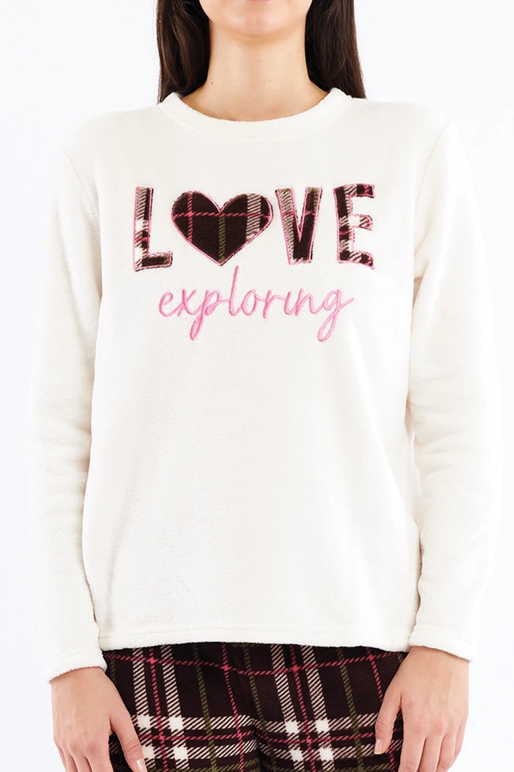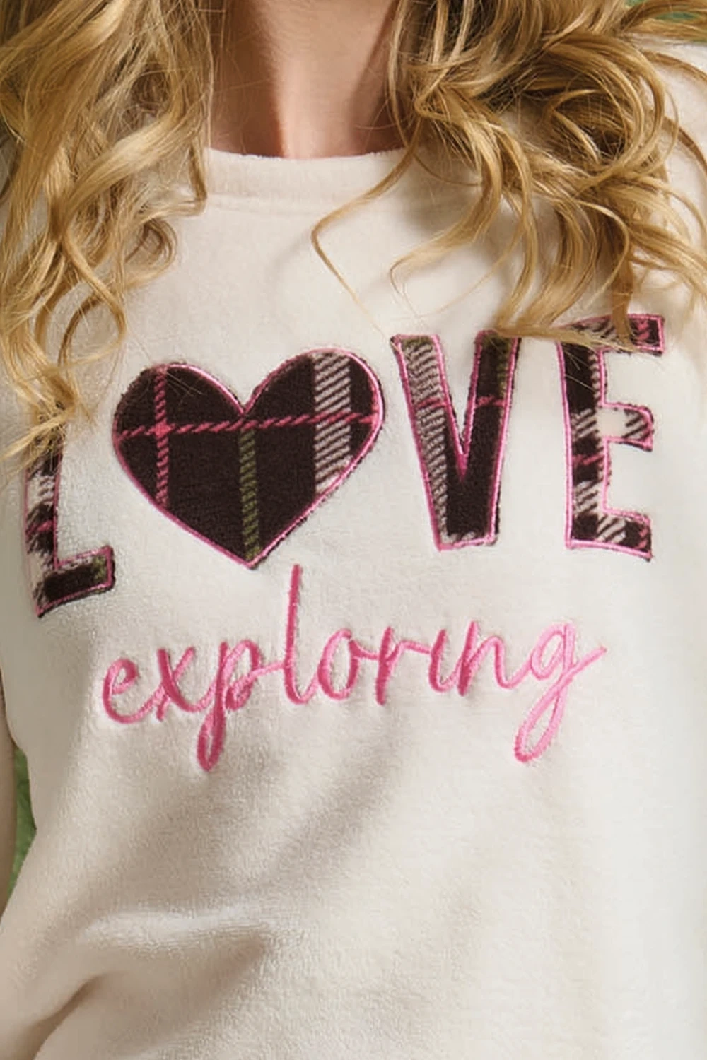 bluza z miękkiego polaru została ozdobiona stylowym napisem „Love Exploring” z