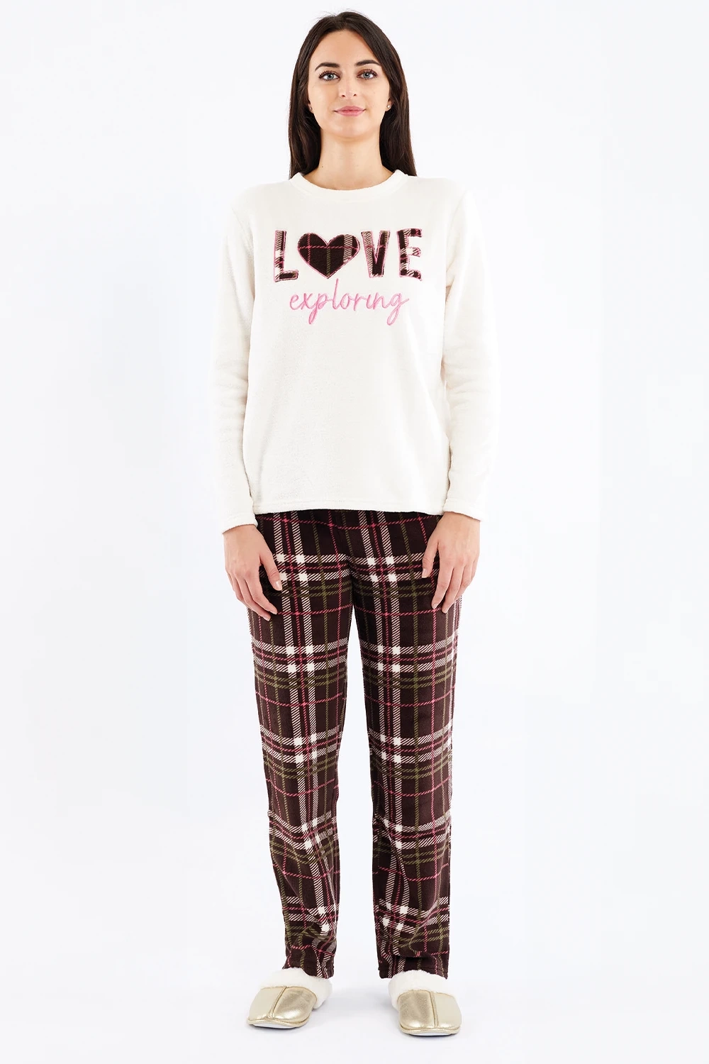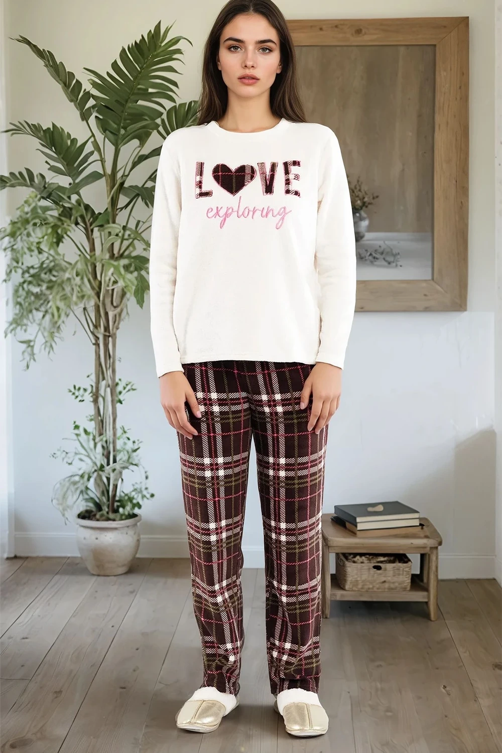 sercem w kraciastym wzorze. Do kompletu dołączone są ciepłe spodnie z wyrazistą