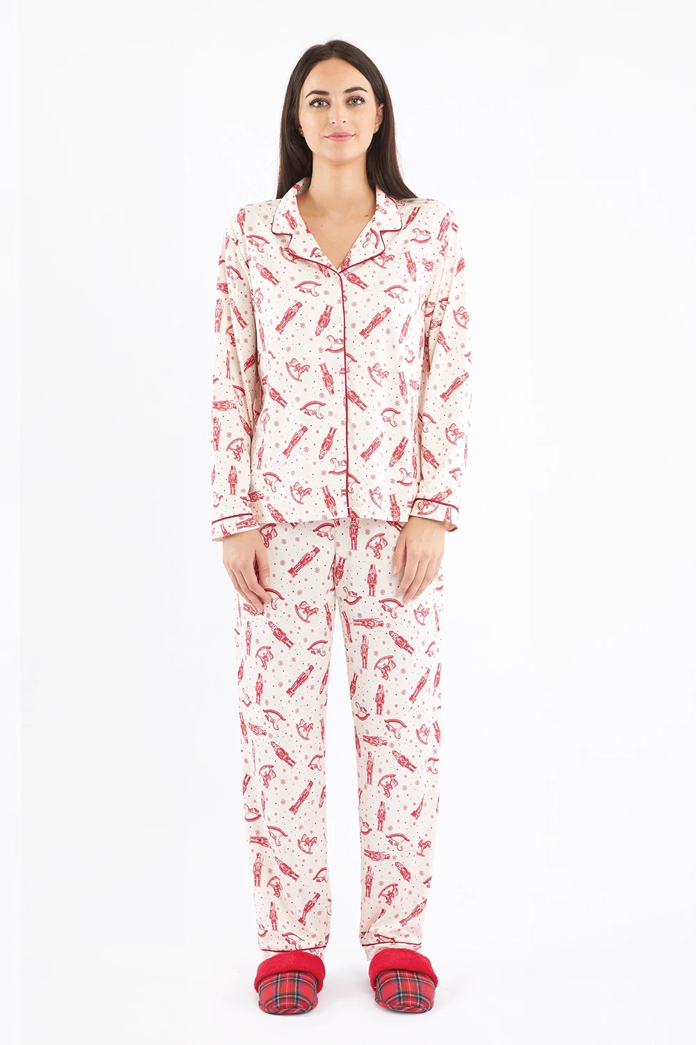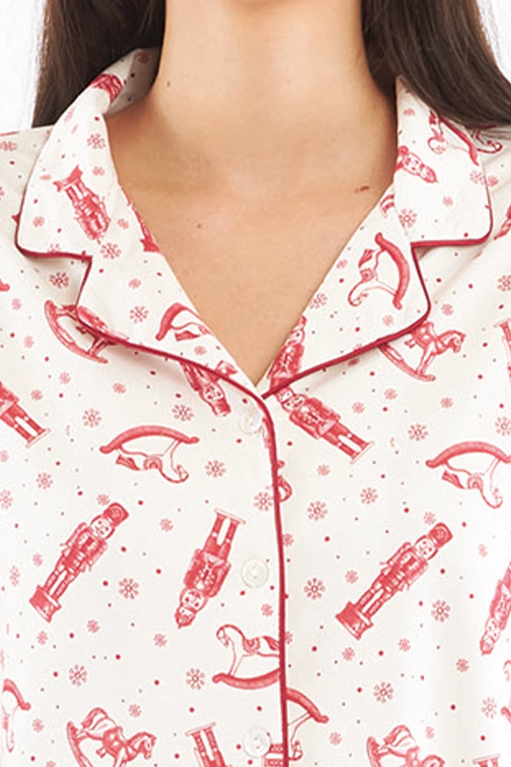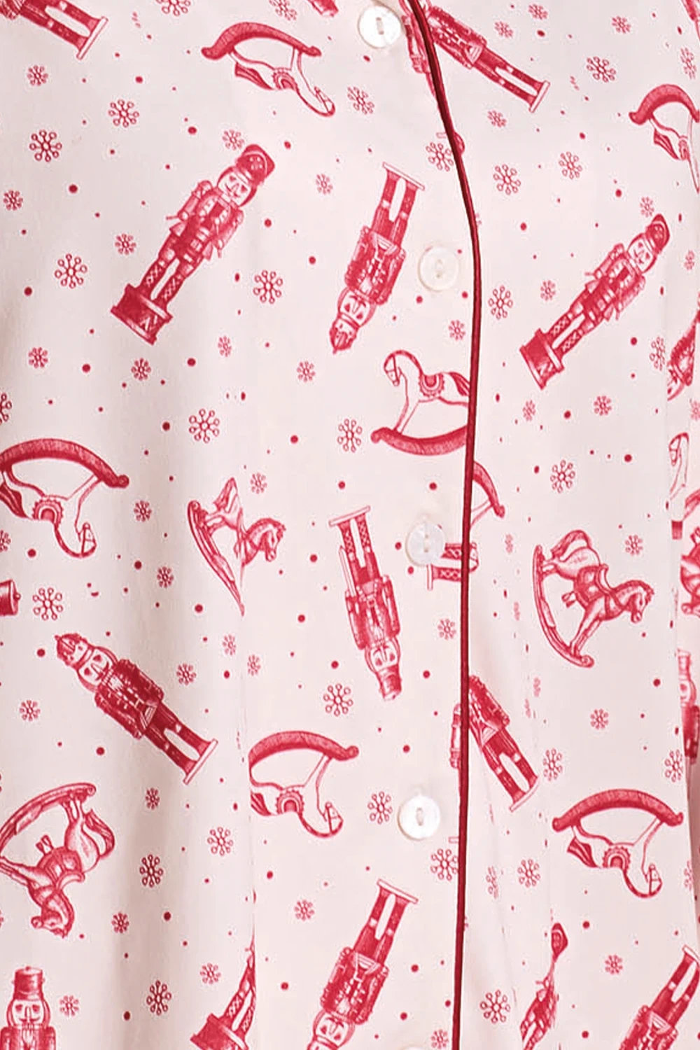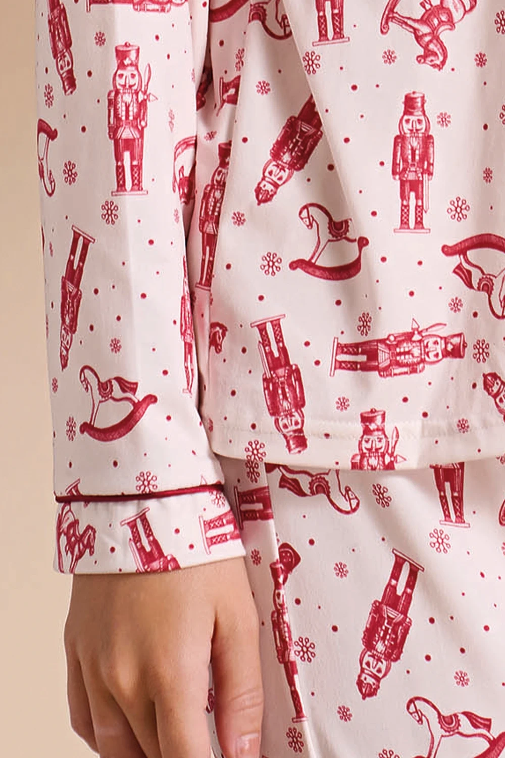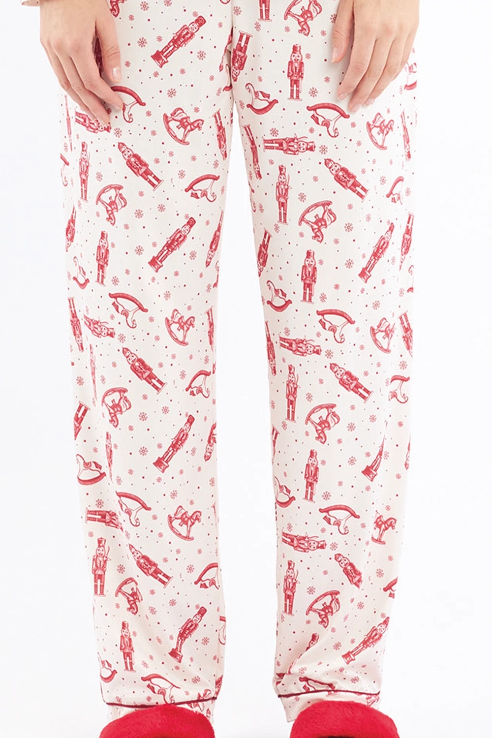 Uroczy wzór – Stylowy nadruk z motywami dziadków do orzechów, koników i śnieżynek w ciepłej czerwieni tworzy klasyczny świąteczny klimat.