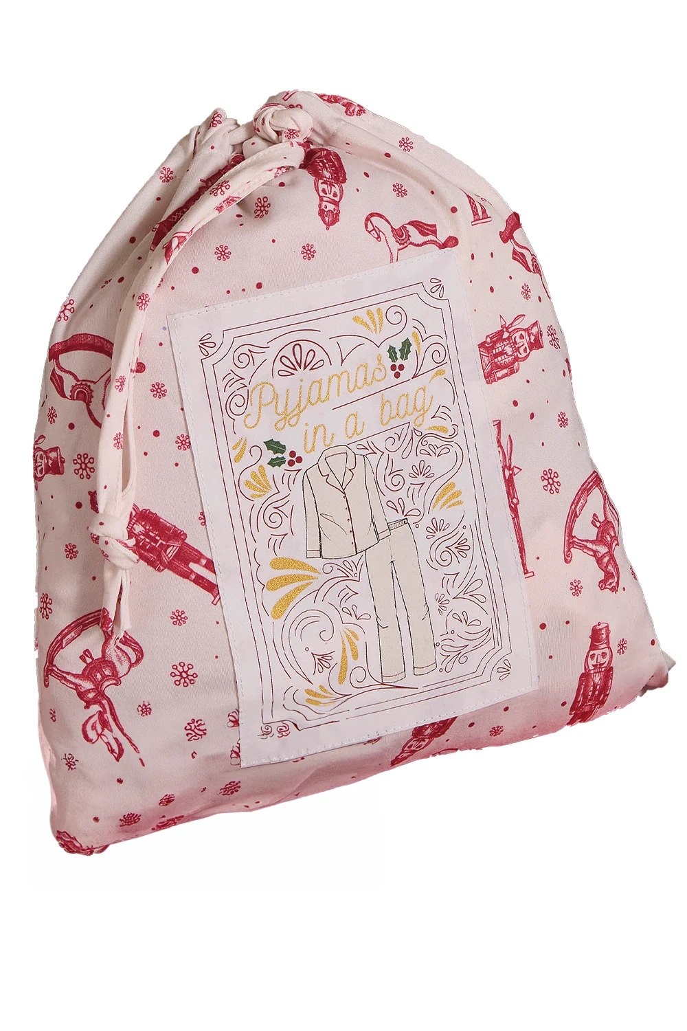 Woreczek prezentowy w komplecie – Tkaninowy woreczek z nadrukiem – świetny dodatek prezentowy, który podkreśla wyjątkowy charakter tej piżamy. Alisee to doskonały wybór na świąteczny upominek – estetyczny, praktyczny i pełen świątecznego uroku.