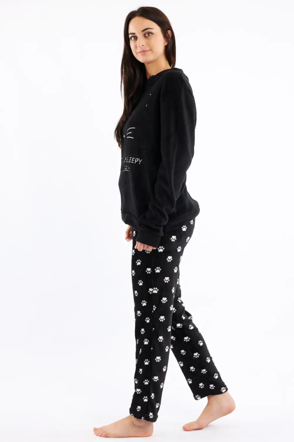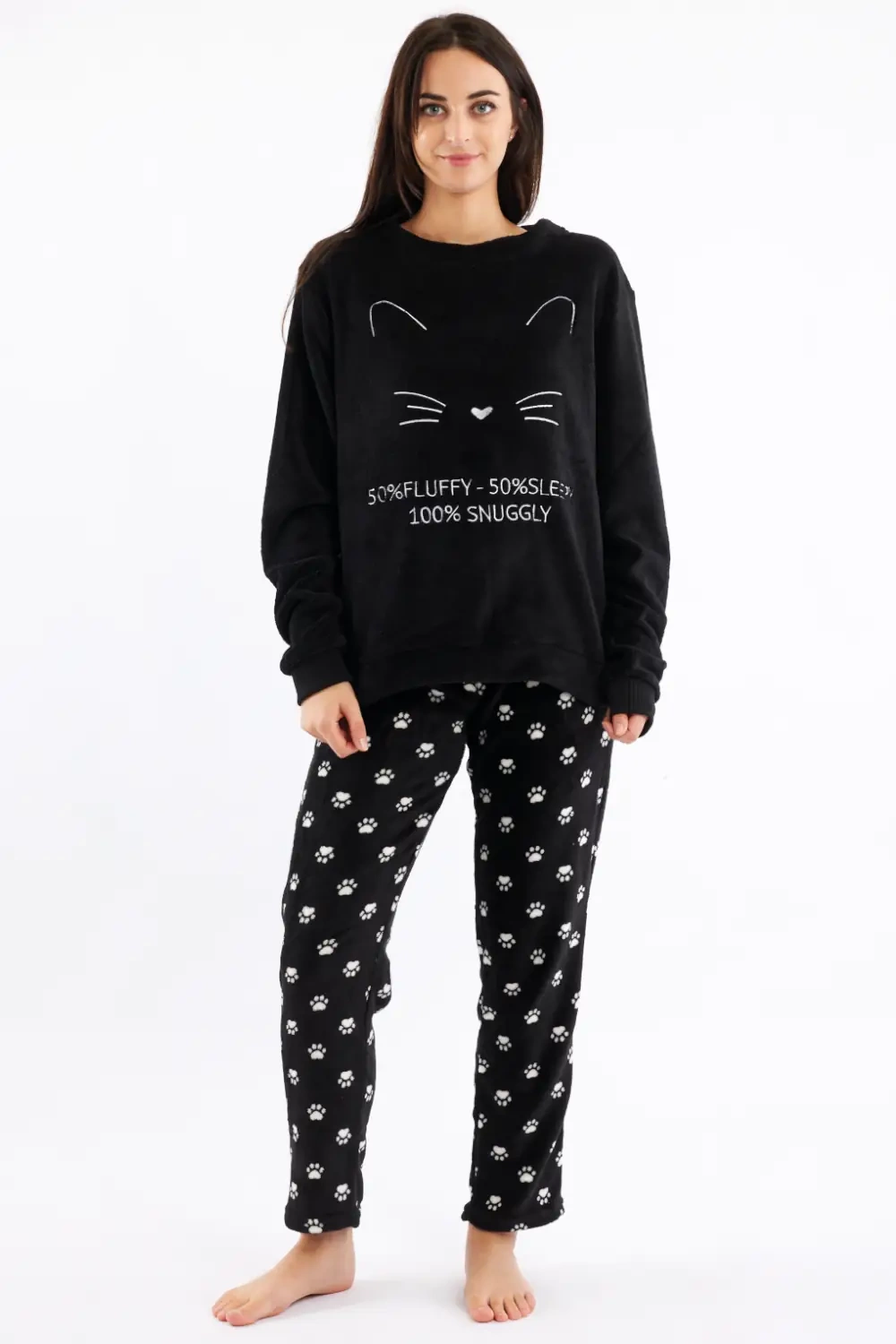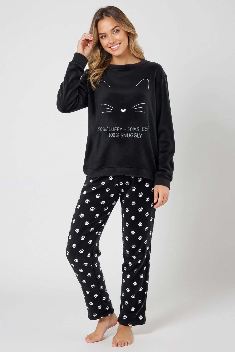 Ciepła miękka polarowa piżama damska z kotkiem FULVIA, czarna