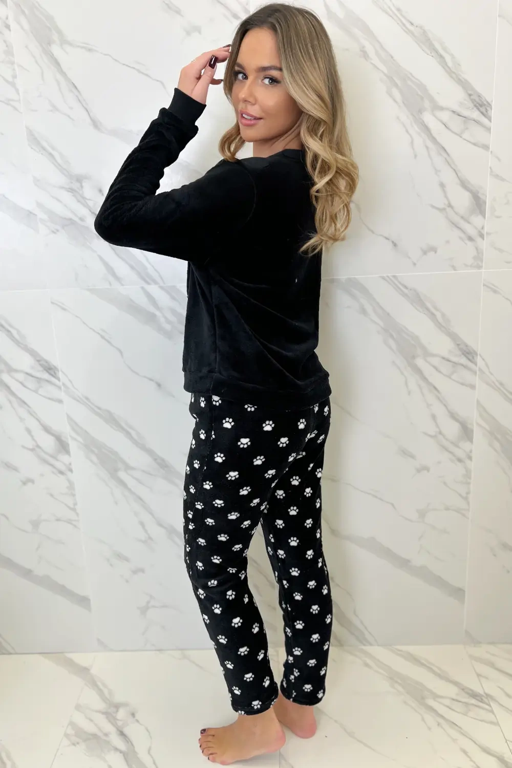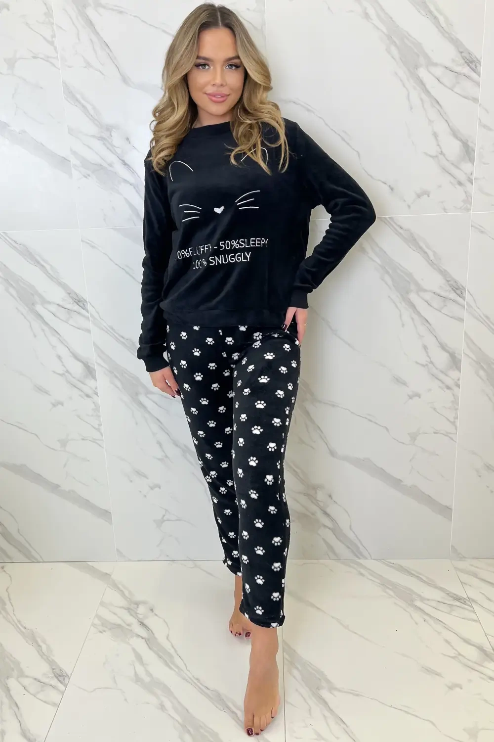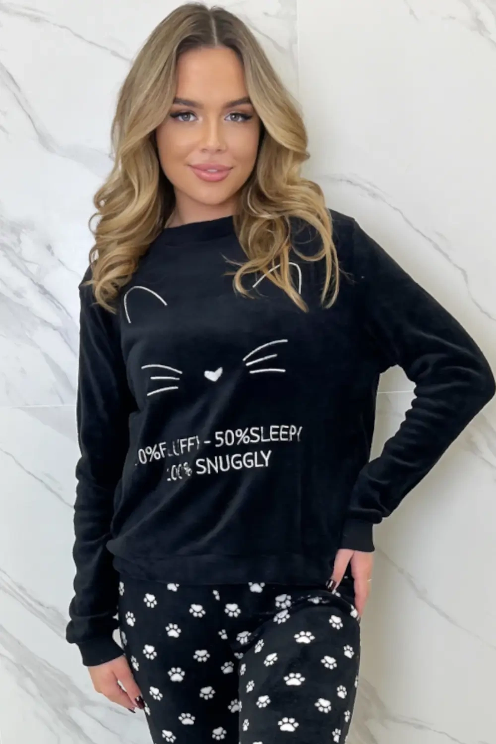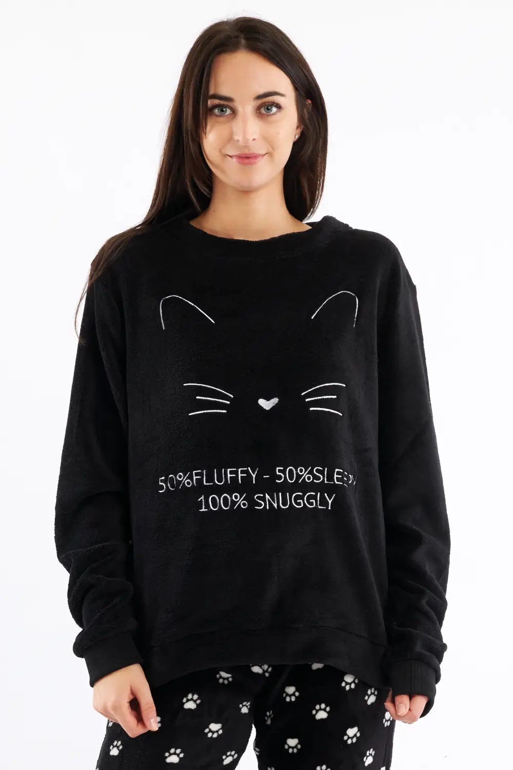 Ciepła miękka polarowa piżama damska z kotkiem FULVIA, czarna