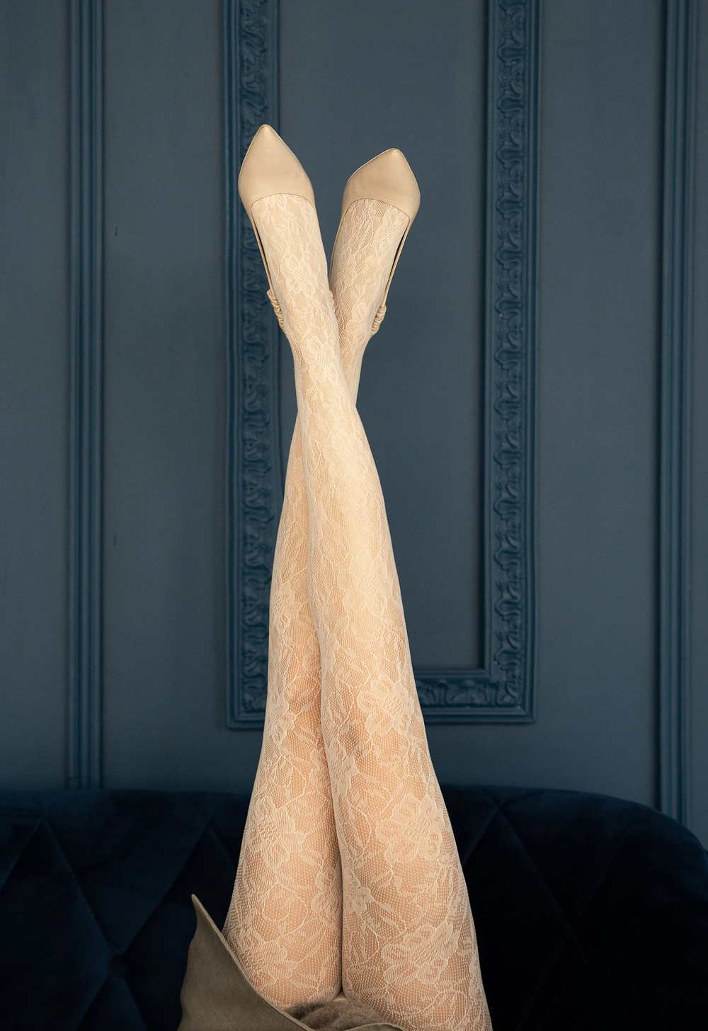 Ażurowe rajstopy damskie - kwiatowy wzór - wysokiej jakości miękka, elastyczna przędza - w pasie gumka - bez wzmocnień na palcach, bez klina Skład: 80% poliamid, 20% elastan