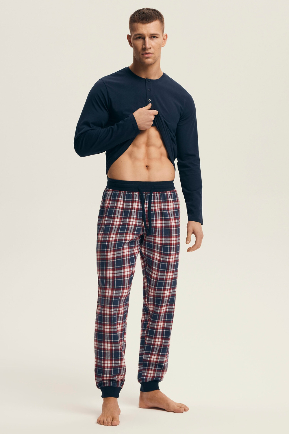 Bawełniana piżama męska - koszulka z długim rękawem - dekolt okrągły zapinany na guziki - długie, luźne spodnie w kratkę z flaneli - nogawki i pas zakończone ściągaczem - w pasie troczek do regulacji wiązania Skład: 100% bawełna