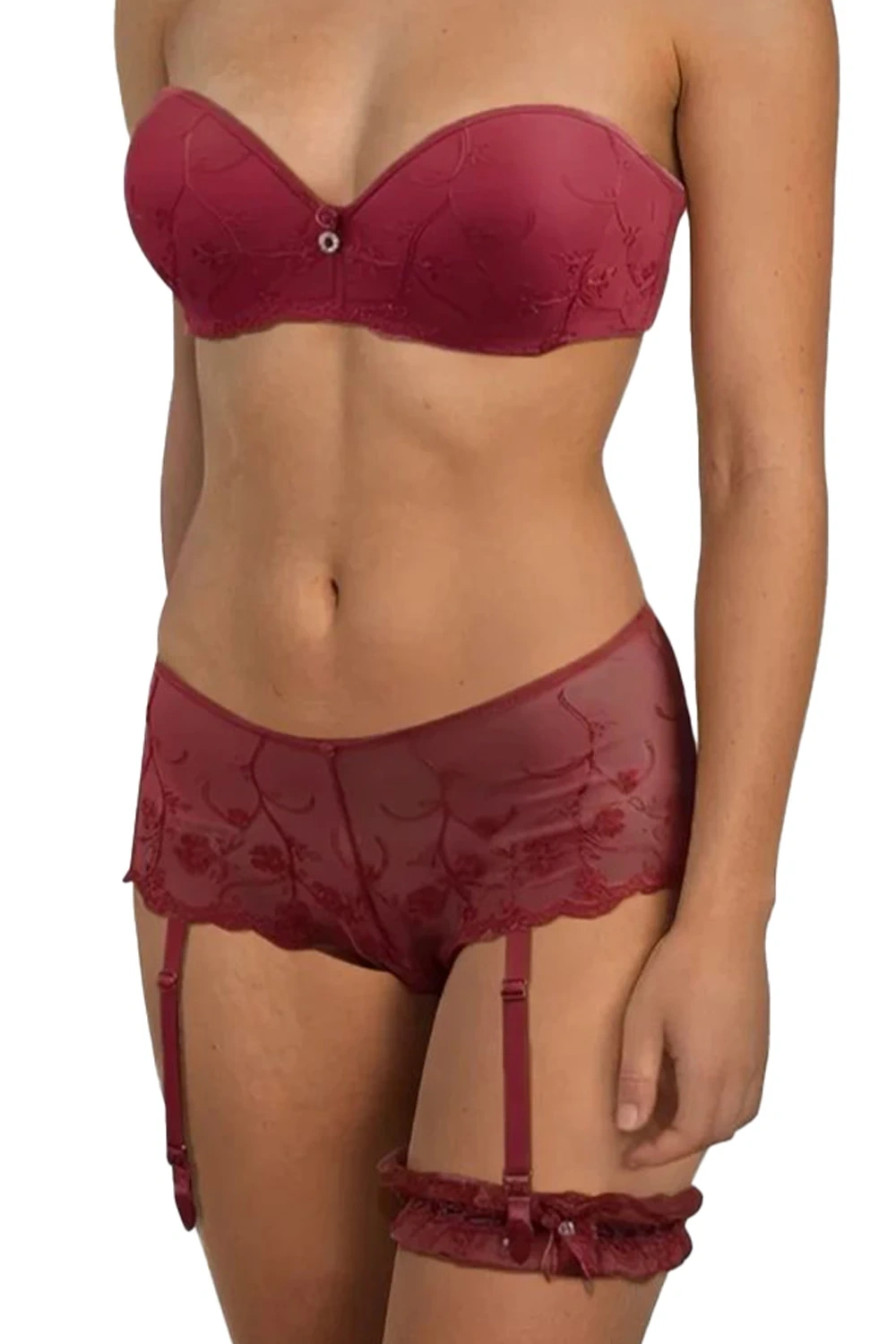 W zestawie znajdziesz: biustonosz na fiszbinach bez ramiączek z usztywnianymi miseczkami typu push-up, dopasowane majtki, paski do pończoch oraz delikatną podwiązkę.