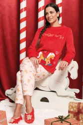 Ciepła polarowa piżama damska z konikiem i napisem MEDDY, czerwona